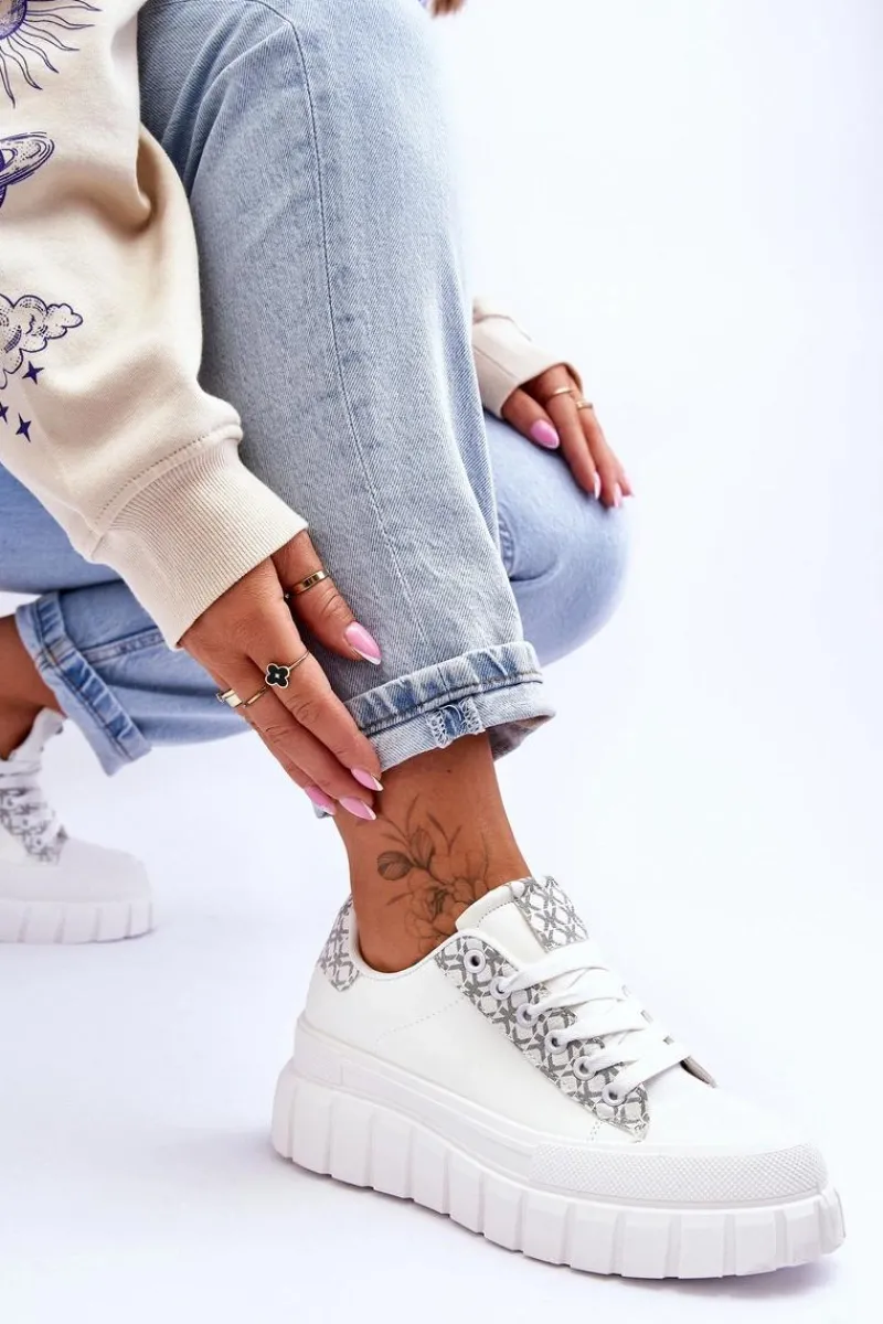 Wygodne, sportowe buty zostały wykonane z eko skóry z modnym wzorem. Model sznurowany. Buty zostały osadzone na masywnej platformie, która została wykonana z tworzywa. Miękka wkładka wykonana z materiału zapewni komfortowe użytkowanie. Nosek zaokrąglony. Model ten pasuje do wielu sportowych stylizacji. Przy wyborze rozmiaru prosimy kierować tabelą rozmiarów.