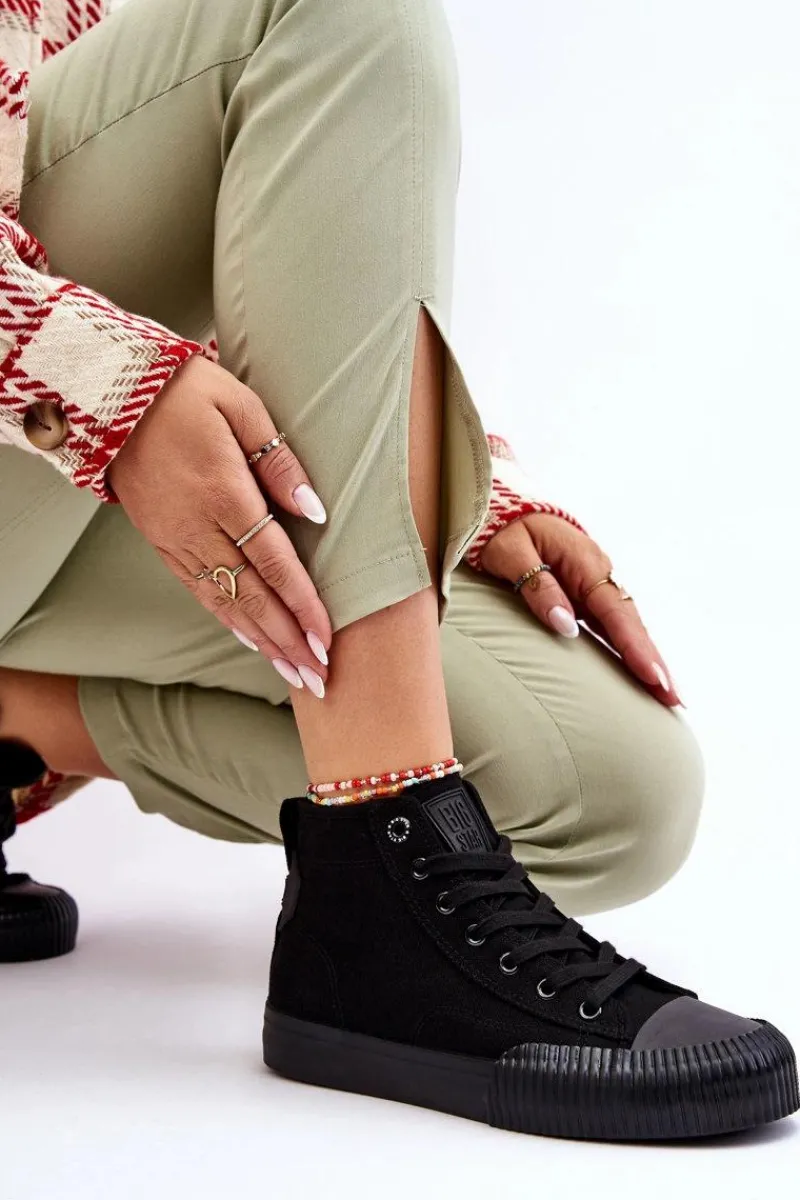 Damskie trampki od polskiej marki BIG STAR z wysoką cholewką za kostkę. Z tyłu posiadają ozdobne logo marki. Buty dobrze dopasowują się do kształtu stopy. Posiadają miękką, materiałową wkładkę. Osadzone na delikatnej platformie z antypoślizgową podeszwą. Model klasycznie sznurowany. Koniecznie sprawdź całą naszą kolekcję butów marki BIG STAR. Przy wyborze rozmiaru prosimy sugerować się tabelą rozmiarów.