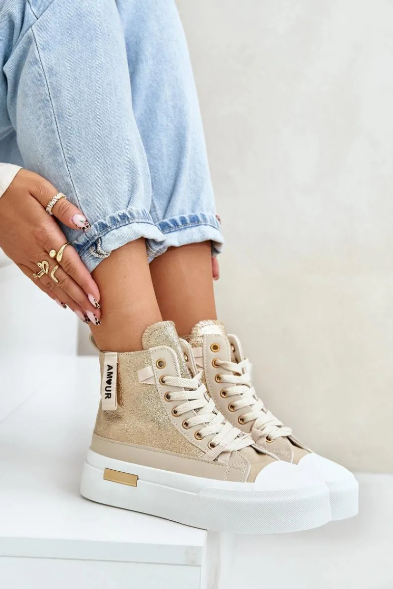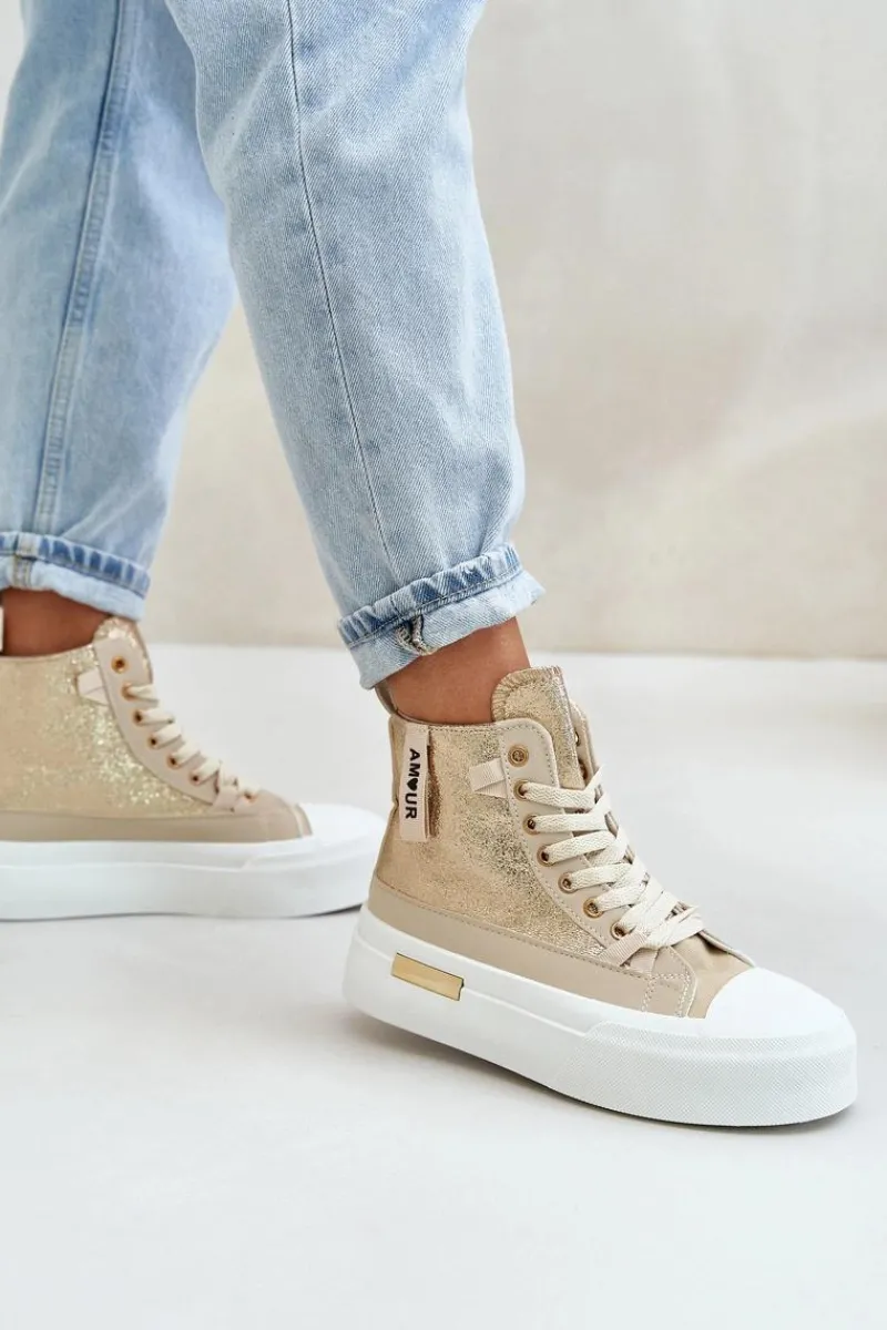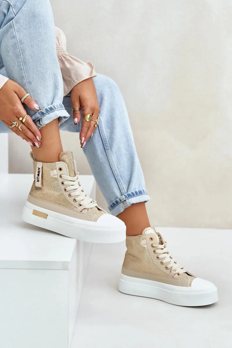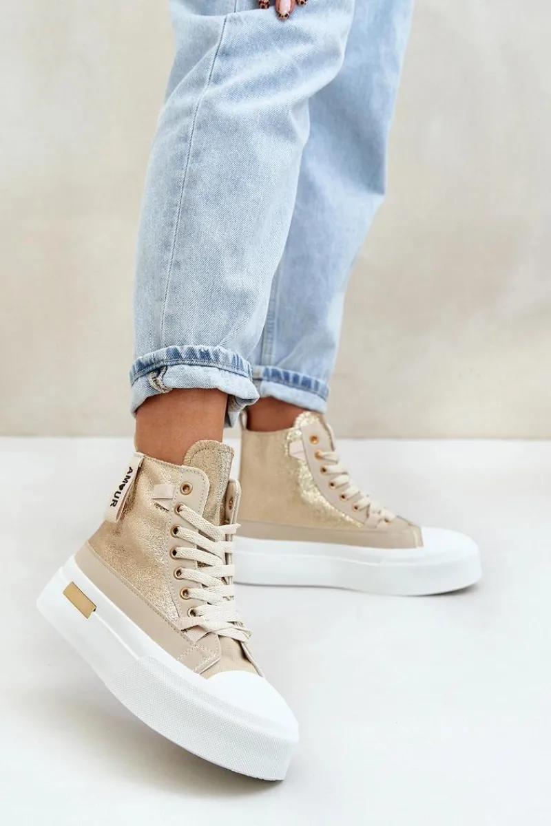 Online Damskie Wysokie Trampki Na Platformie Beżowo-Złote Averira Damskie Trampki Damskie Wysokie