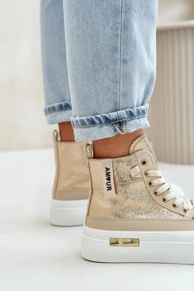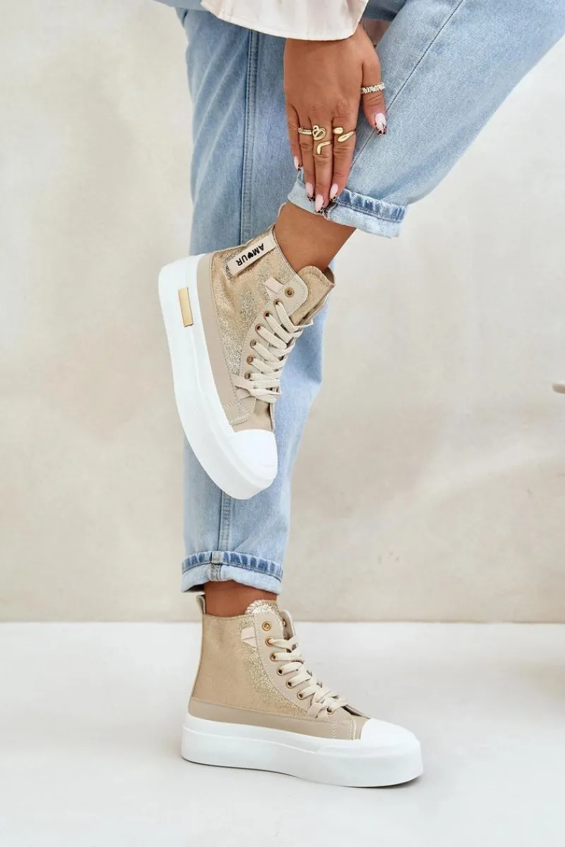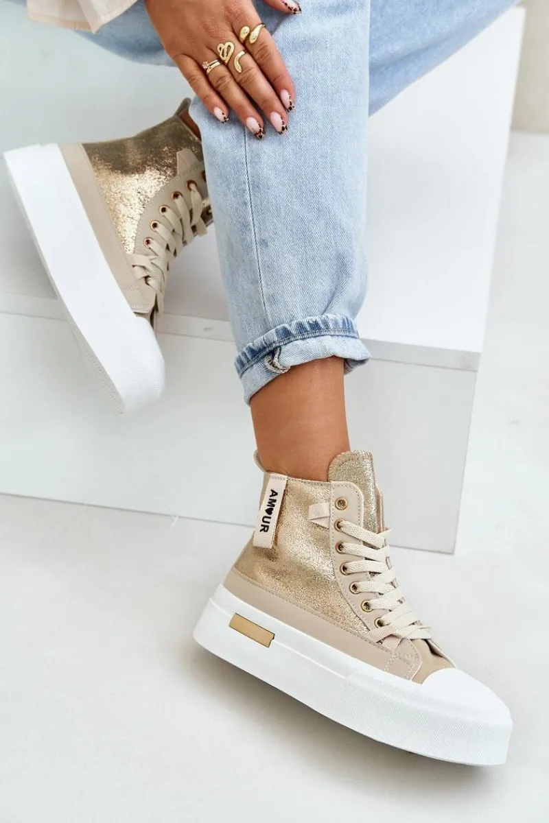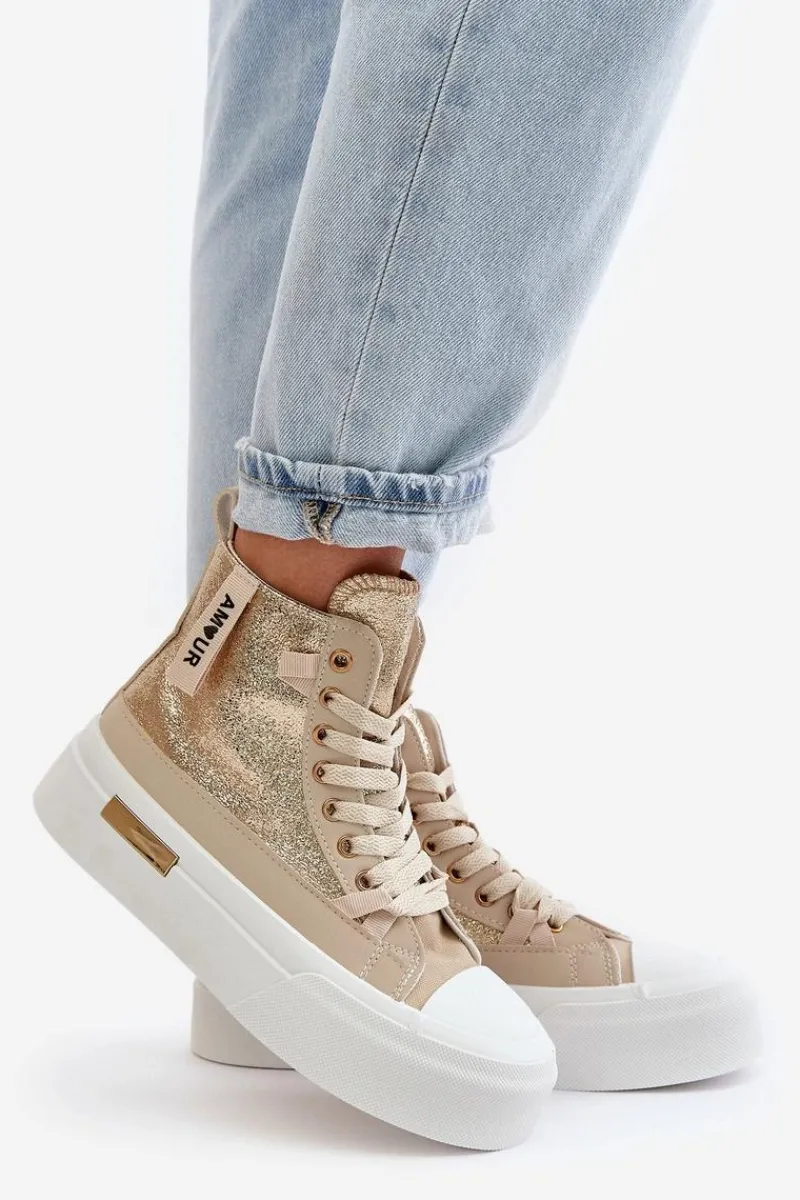 Online Damskie Wysokie Trampki Na Platformie Beżowo-Złote Averira Damskie Trampki Damskie Wysokie