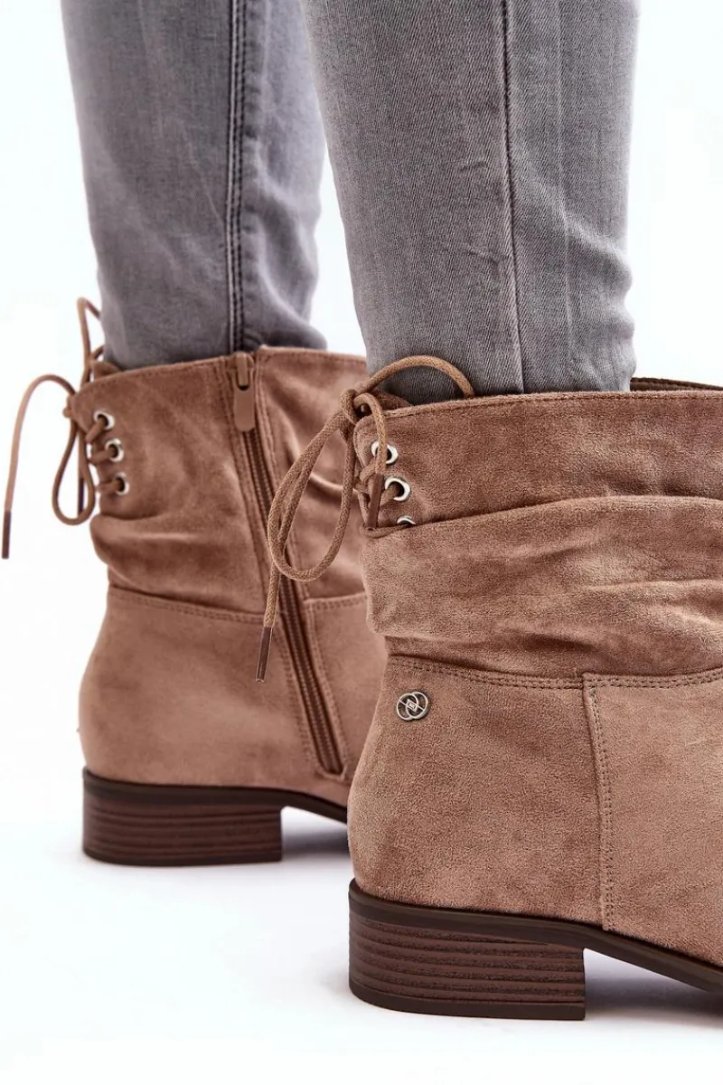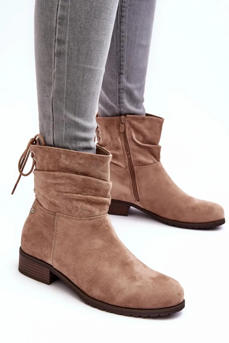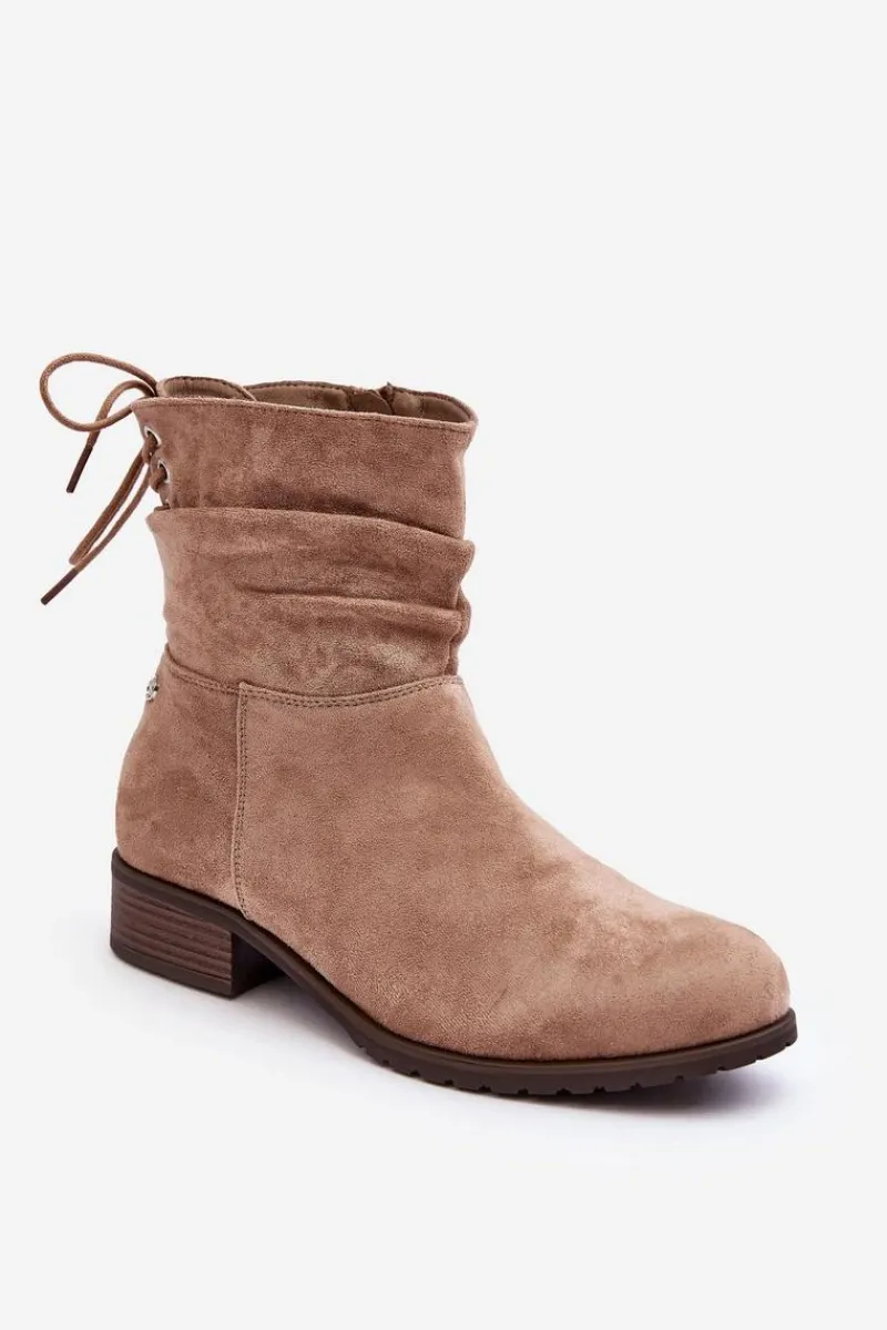 Damskie botki wykonane z eko zamszu. Osadzone na płaskim obcasie. Zapinane na suwak z boku cholewki. Z tyłu ozdobne wiązanie. Noski zaokrąglone. Środek ocieplony kocem obuwniczym. Świetny model do wielu stylizacji! Przy wyborze rozmiaru prosimy sugerować się tabelą rozmiarów.