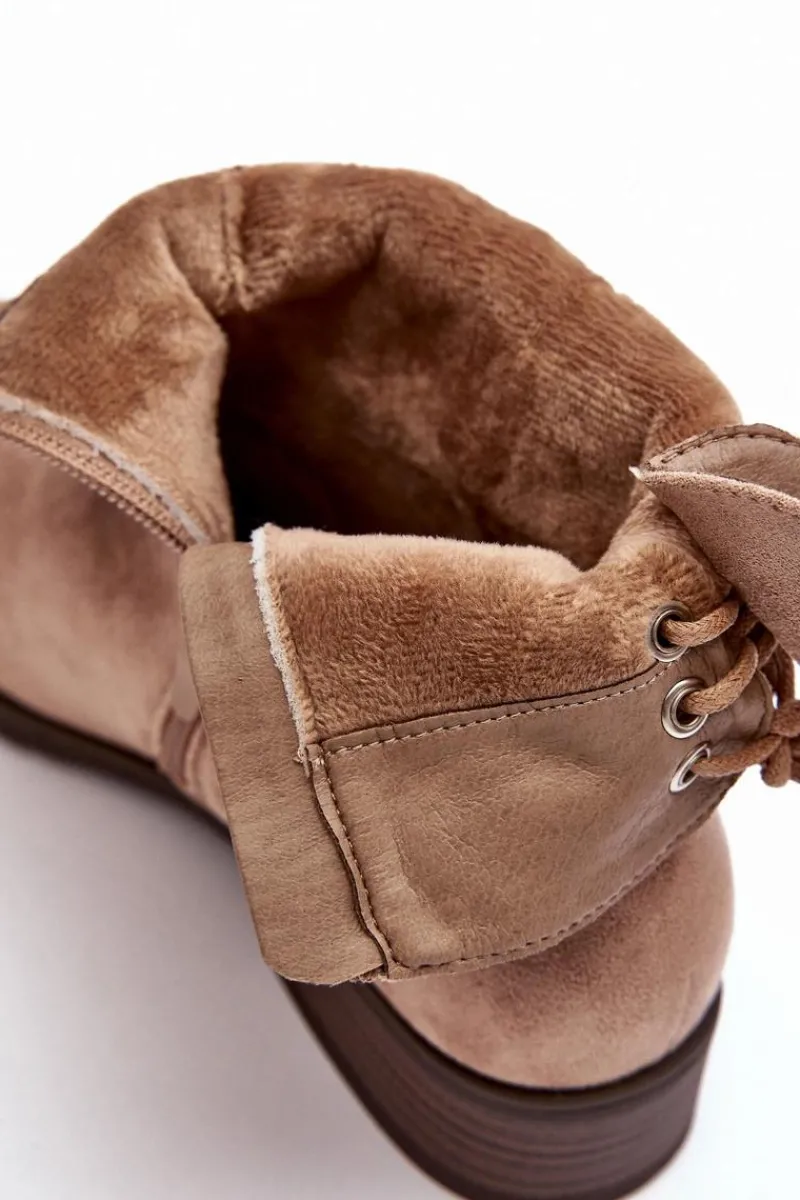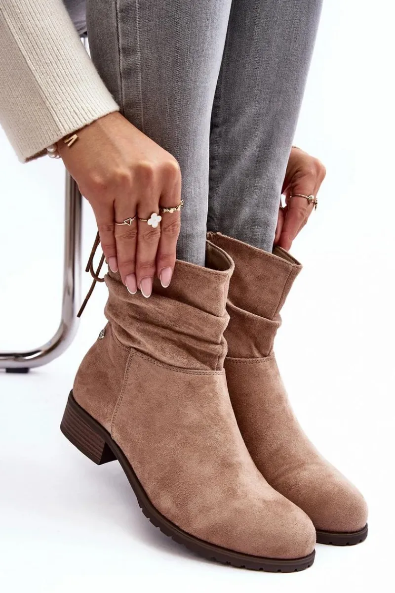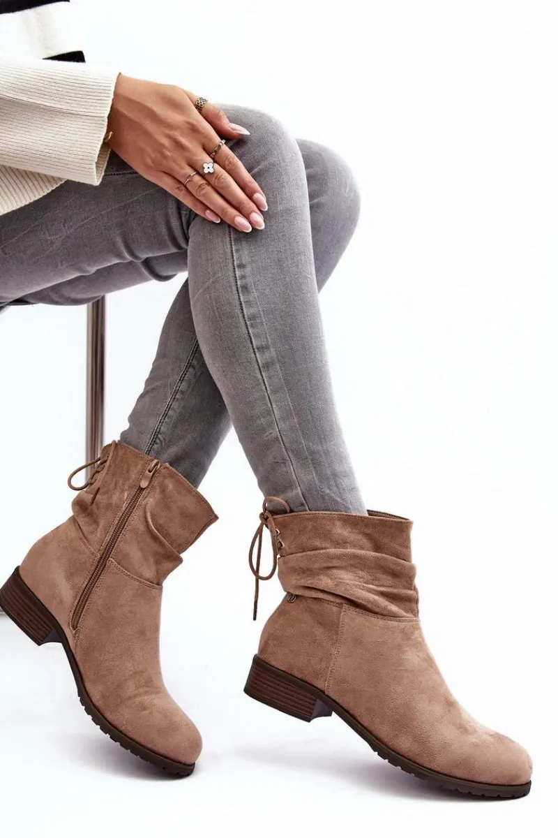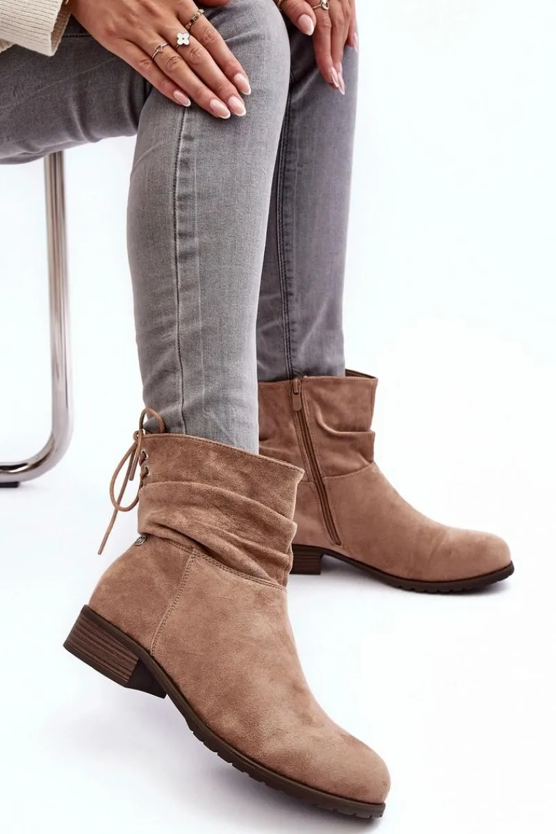 Damskie botki wykonane z eko zamszu. Osadzone na płaskim obcasie. Zapinane na suwak z boku cholewki. Z tyłu ozdobne wiązanie. Noski zaokrąglone. Środek ocieplony kocem obuwniczym. Świetny model do wielu stylizacji! Przy wyborze rozmiaru prosimy sugerować się tabelą rozmiarów.