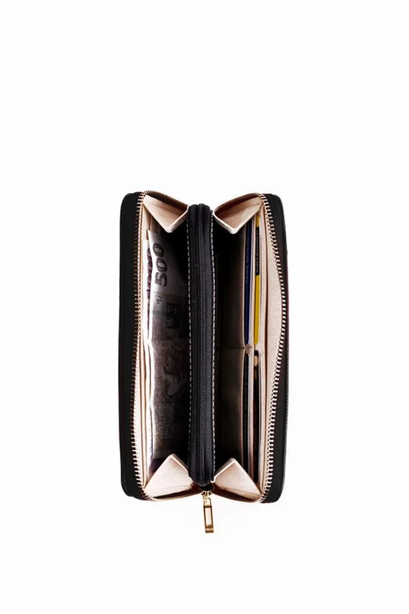 Duży portfel wykonany z eko skóry. Z przodu posiada emblemat, natomiast z tyłu znajduje się kieszonka zapinana na suwak. Dodatkowo do portfela jest dołączony paseczek. W środku posiada miejsce na wizytówki oraz banknoty, a także kiszonkę zapinaną na suwak. Piękny, klasyczny portfel dostępny w wielu modnych kolorach. Musisz go mieć!