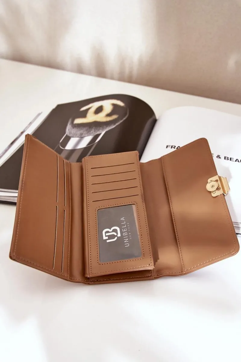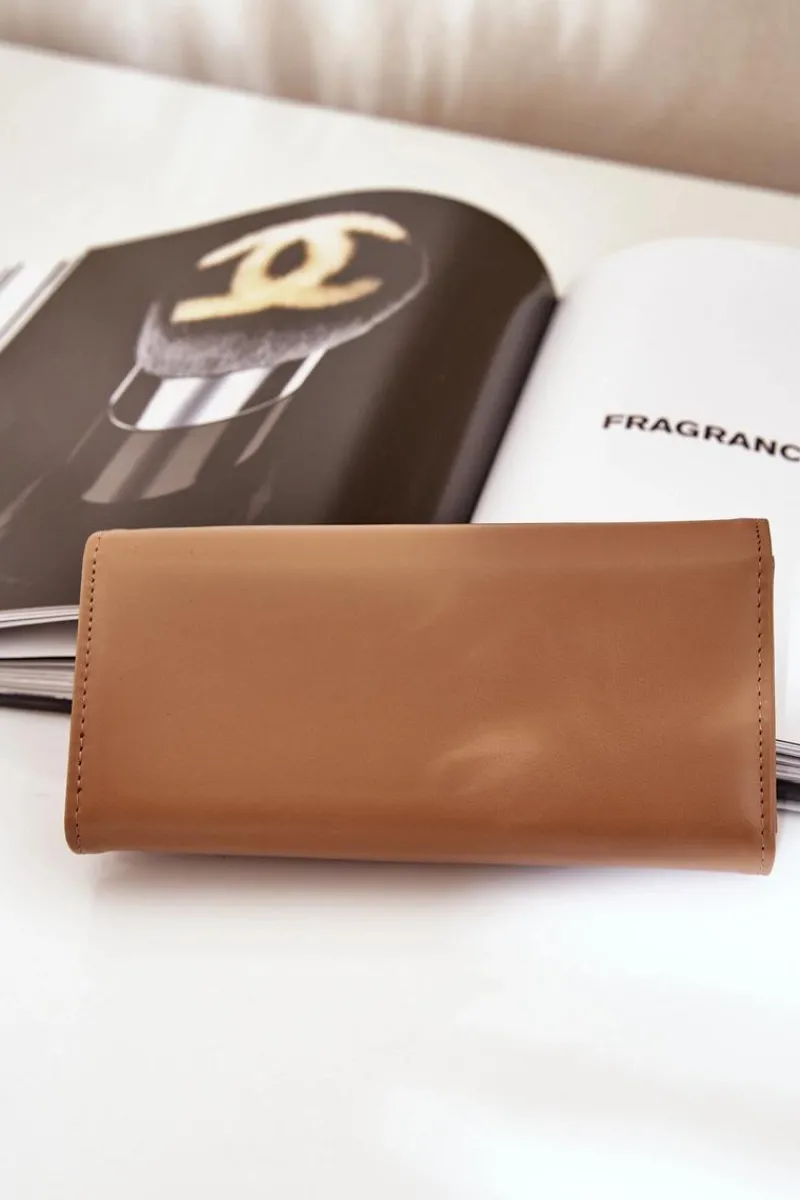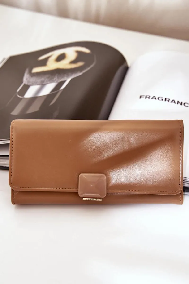 Stylowy damski portfel wykonany z eko skóry, zapinany na magnes. Wnętrze wyposażone w kieszeń na monety, przegródki na karty, miejsce na banknoty oraz fotografię. Elegancki i funkcjonalny, doskonały zarówno na co dzień, jak i jako prezent dla bliskiej osoby!