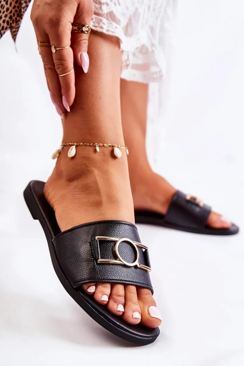 Modne damskie klapki na płaskim obcasie to idealny model na co dzień! Wykonane z eko skóry. Model wsuwany, z odkrytym, zaokrąglonym noskiem. Z przodu znajduje się ozdobny emblemat. Podeszwa wykonana z gumowego tworzywa, antypoślizgowa. Wkładka wykonana z eko skóry. Jest miękka i komfortowa w użytkowaniu. Świetny model, idealny do wielu stylizacji! Koniecznie powinnaś je mieć! Przy wyborze rozmiaru prosimy sugerować się tabelą rozmiarów.