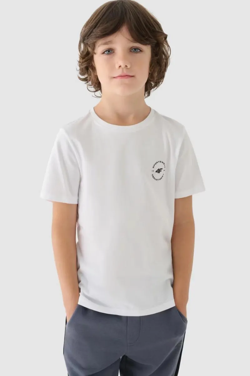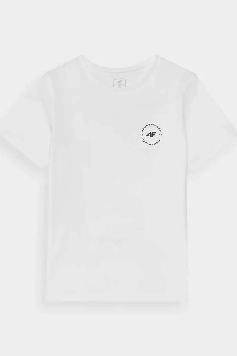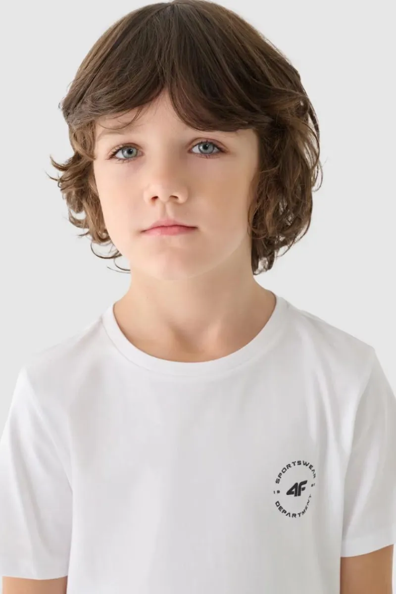 T-shirt bez nadruku chłopięcy idealnie sprawdzi się jako element zarówno casualowych, jak i sportowych stylizacji na co dzień. Posiada krój regular, który wygodnie dopasowuje się do sylwetki oraz standardową długość sięgającą do linii bioder. Splot single jersey z jednostronną gładką powierzchnią sprawia, że koszulka jest elastyczna i komfortowa w noszeniu. Koszulka bez nadruku chłopięca jest miękka, lekka i przewiewna. Doskonale nadaje się do noszenia zwłaszcza w okresie letnim bądź jako podkoszulek pod bluzę czy koszulę. T-shirt 4F chłopięcy jest wykonany w 100% z bawełny, dzięki czemu jest miękki, trwały i przyjemny w dotyku. Okrągły dekolt jest zakończony lekkim ribowaniem. Z przodu widoczny napis „4F Sportswear Department”.