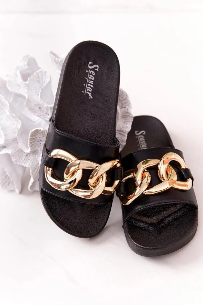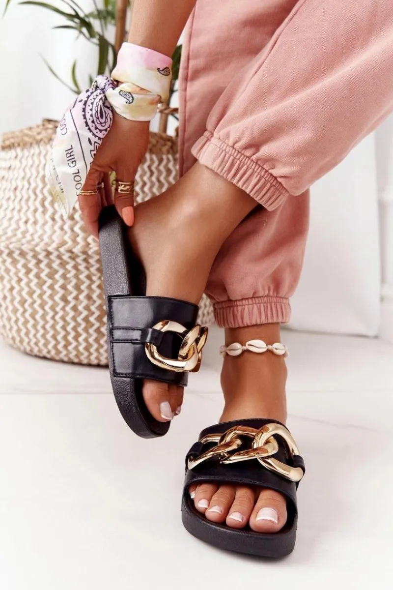 Gumowe klapki damskie z ozdobnym łańcuchem. Cholewka wykonana jest z eko skóry. Koniecznie sprawdź całą naszą kolekcję klapek damskich! Przy wyborze rozmiaru prosimy sugerować się tabelą rozmiarów.