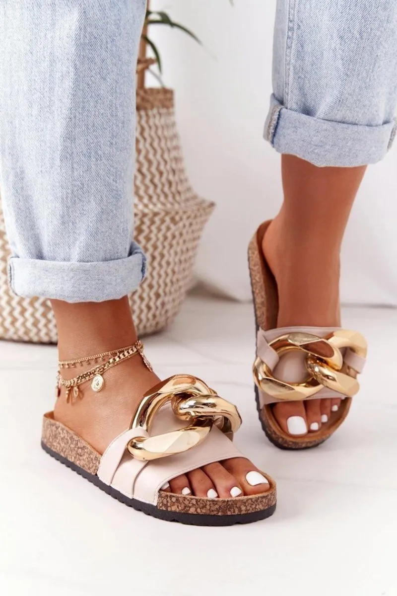 Wyjątkowe klapki damskie wykonane z eko skóry. Buty posiadają profilowaną wkładkę, która zagwarantuje komfort. Modny fason z masywnym łańcuchem urozmaici Twoje stylizacje! Przy wyborze rozmiaru prosimy sugerować się tabelą rozmiarów.