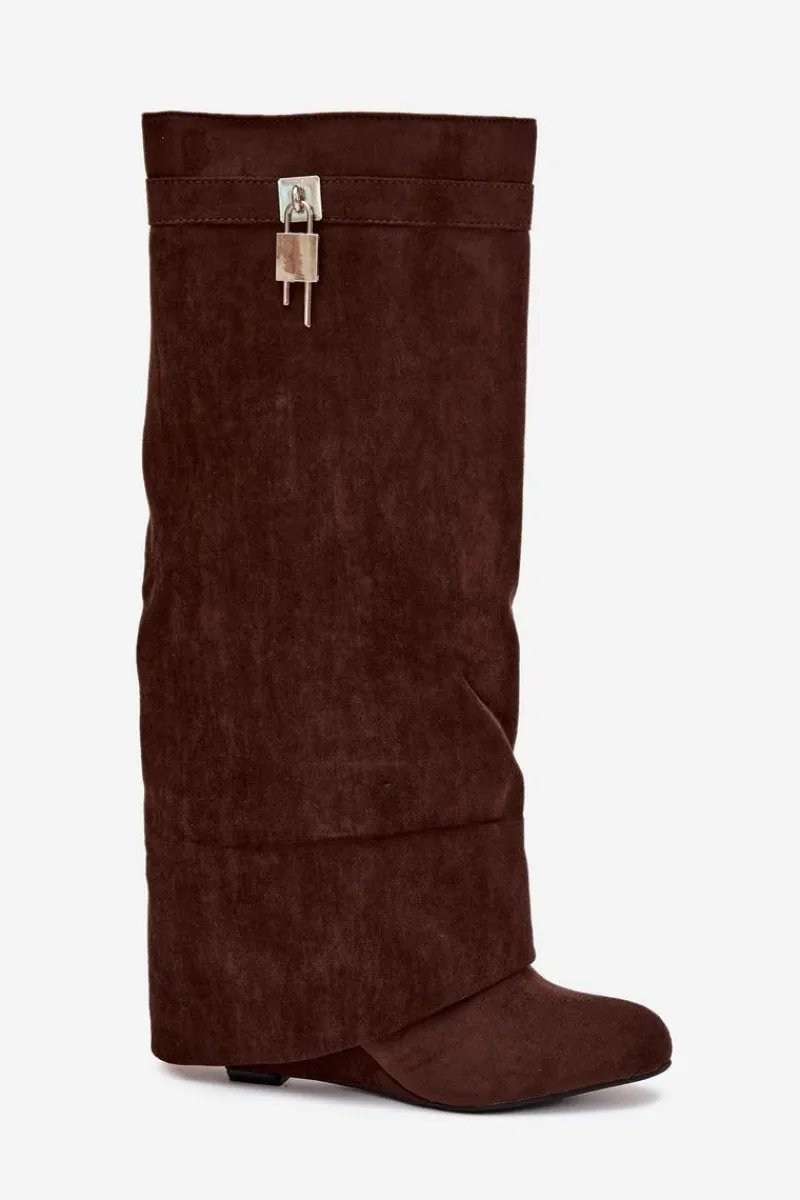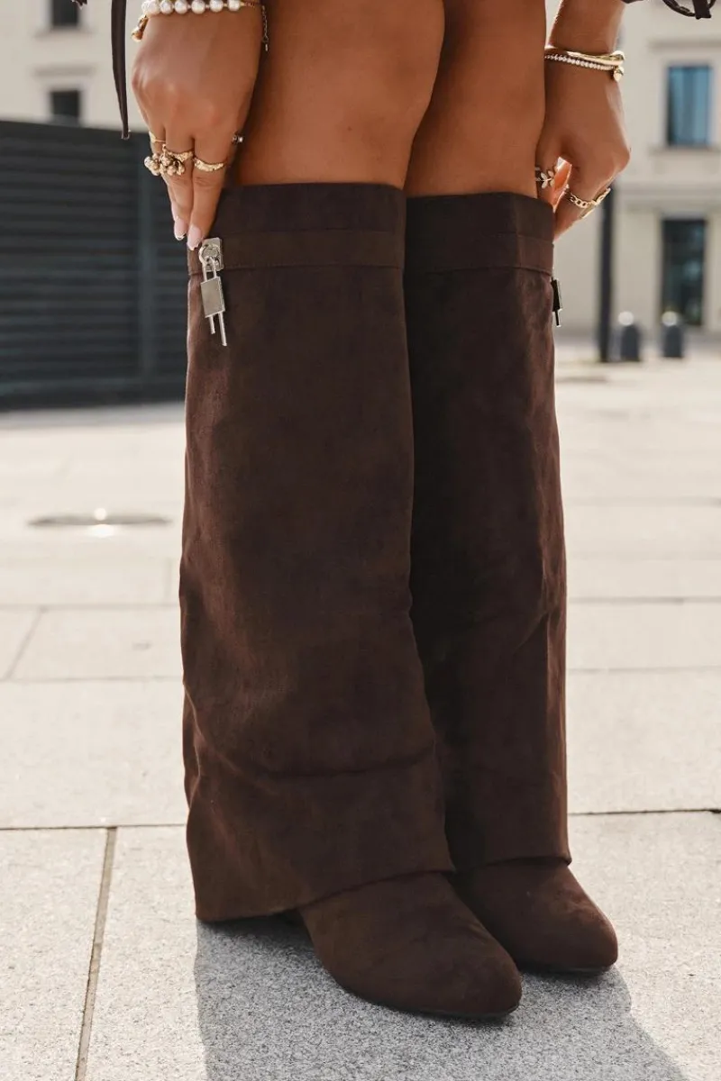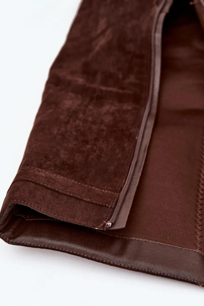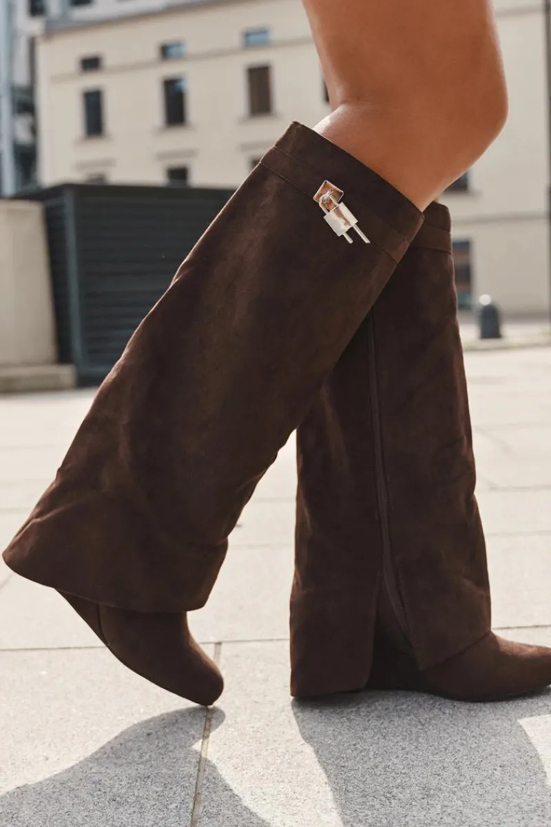 Kozaki damskie wykonane z miękkiego eko zamszu to idealne połączenie wygody i elegancji. Osadzone na koturnie. Model zapinany jest na praktyczny zamek, a efekt wywiniętej cholewki nadaje mu wyjątkowego charakteru. Całość uzupełnia pasek z ozdobnym detalem umieszczony na górze, który stanowi subtelny akcent dekoracyjny. To stylowe kozaki, które świetnie sprawdzą się zarówno w codziennych, jak i eleganckich stylizacjach. Przy wyborze rozmiaru prosimy sugerować się tabelą rozmiarów.