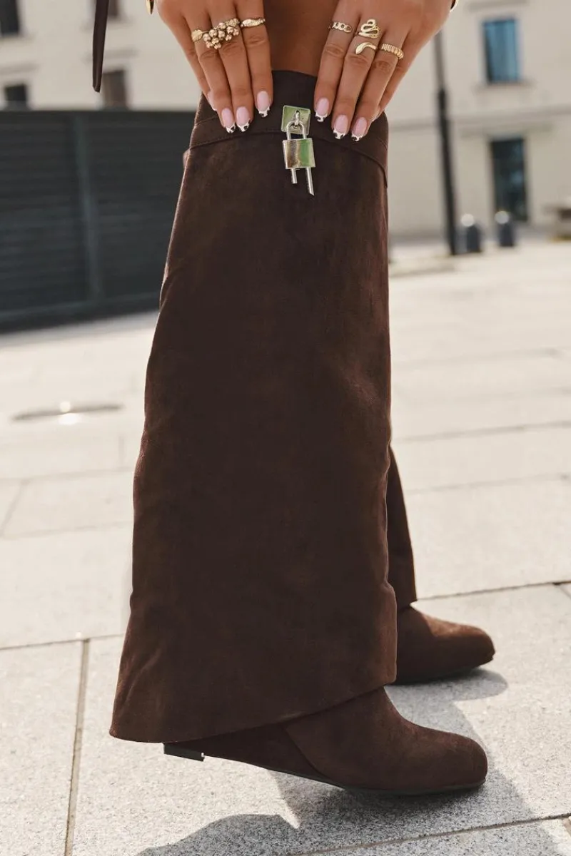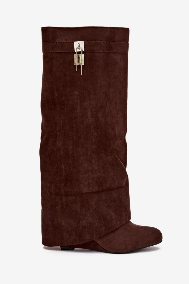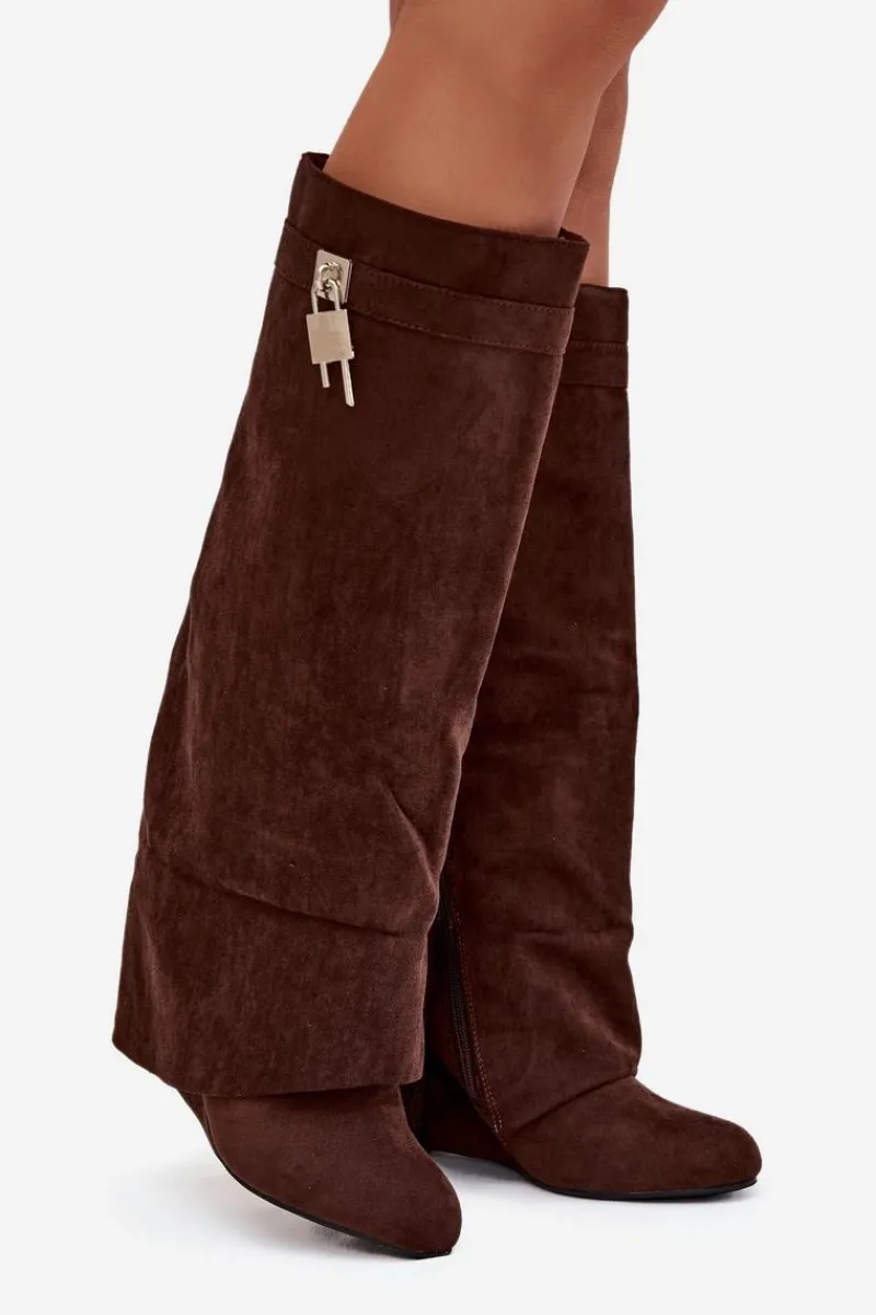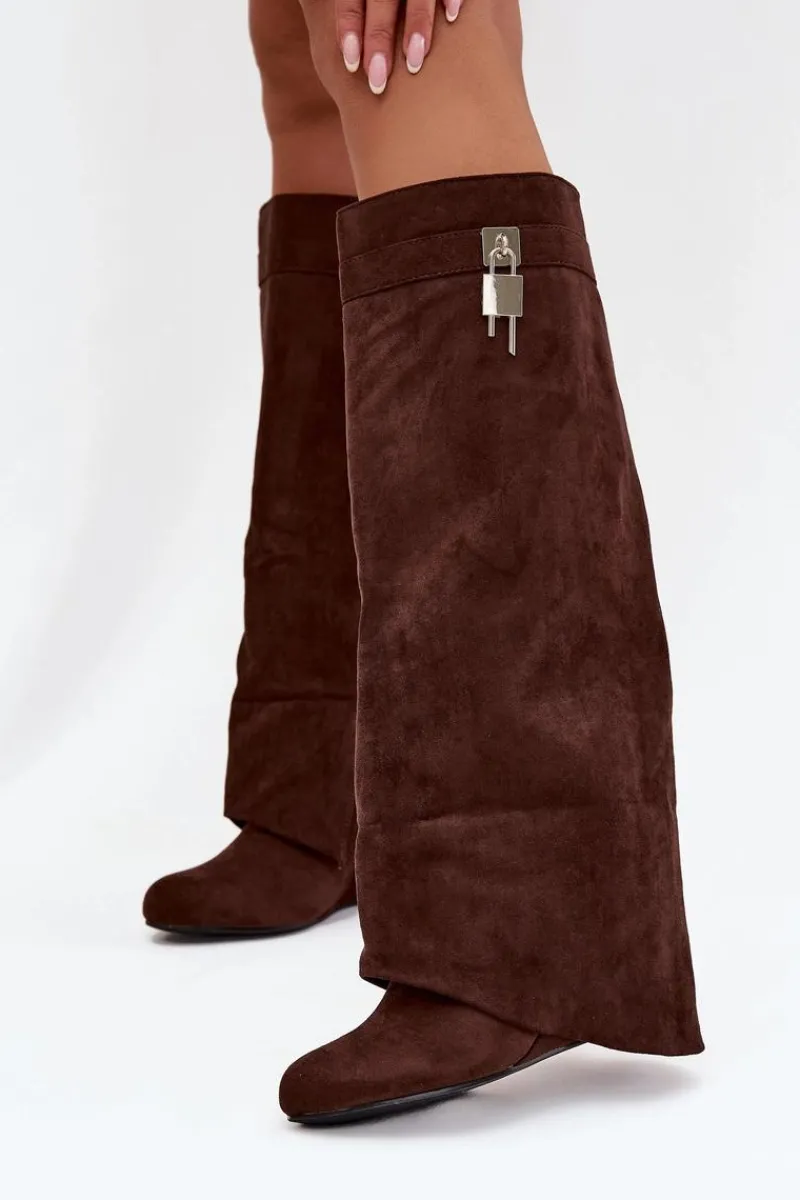 Kozaki damskie wykonane z miękkiego eko zamszu to idealne połączenie wygody i elegancji. Osadzone na koturnie. Model zapinany jest na praktyczny zamek, a efekt wywiniętej cholewki nadaje mu wyjątkowego charakteru. Całość uzupełnia pasek z ozdobnym detalem umieszczony na górze, który stanowi subtelny akcent dekoracyjny. To stylowe kozaki, które świetnie sprawdzą się zarówno w codziennych, jak i eleganckich stylizacjach. Przy wyborze rozmiaru prosimy sugerować się tabelą rozmiarów.