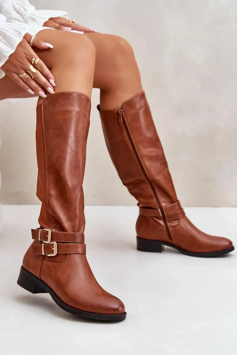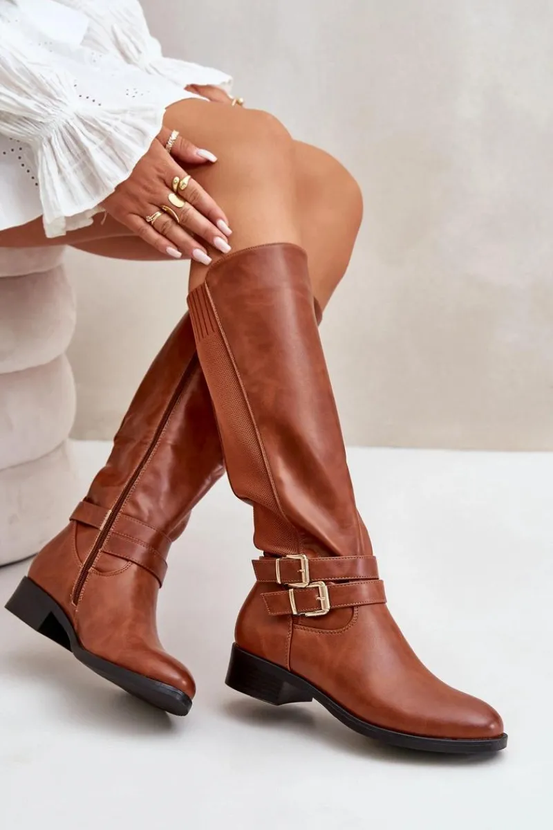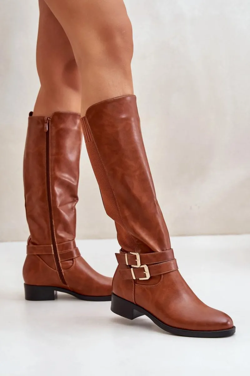 Damskie kozaki o klasycznym kroju, wykonane z eko skóry. Osadzone na płaskim obcasie, co zapewnia wygodę noszenia na co dzień. Noski zaokrąglone, a cholewka sięga przed kolano, dodając elegancji i wydłużając sylwetkę. Zapinane na zamek, ułatwiający zakładanie. Dodatkowym atutem są ozdobne paski ze złotymi klamrami, które nadają wyjątkowego charakteru. Przy wyborze rozmiaru prosimy sugerować się tabelą rozmiarów.