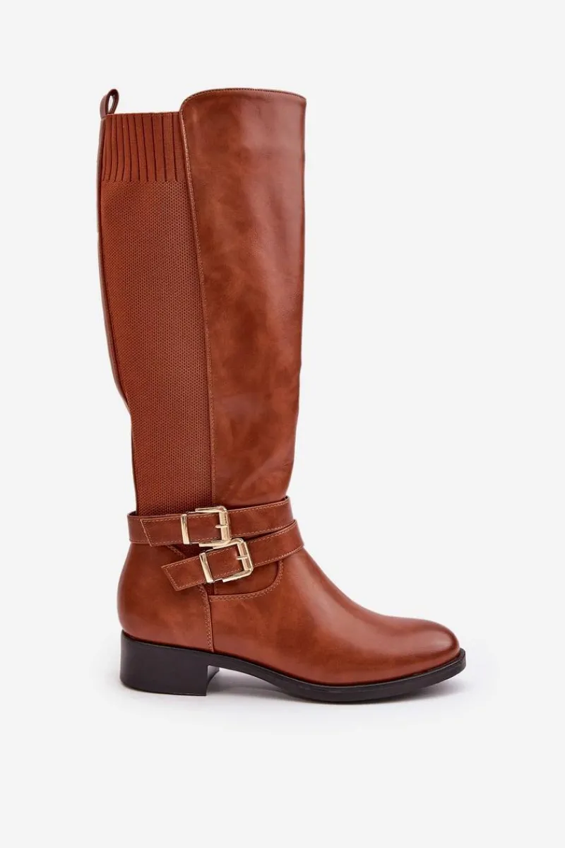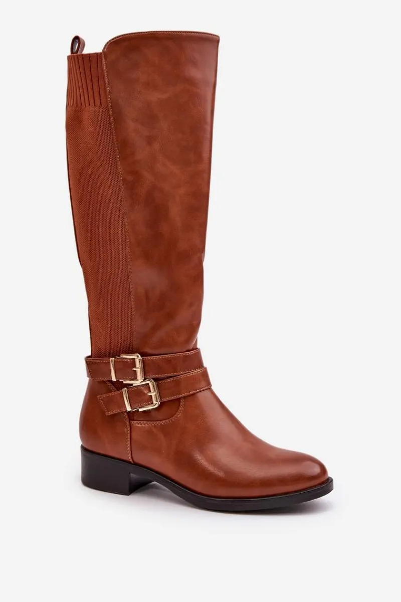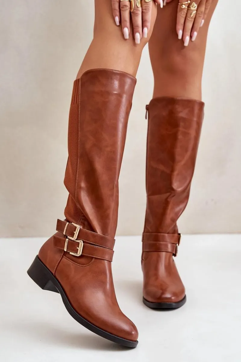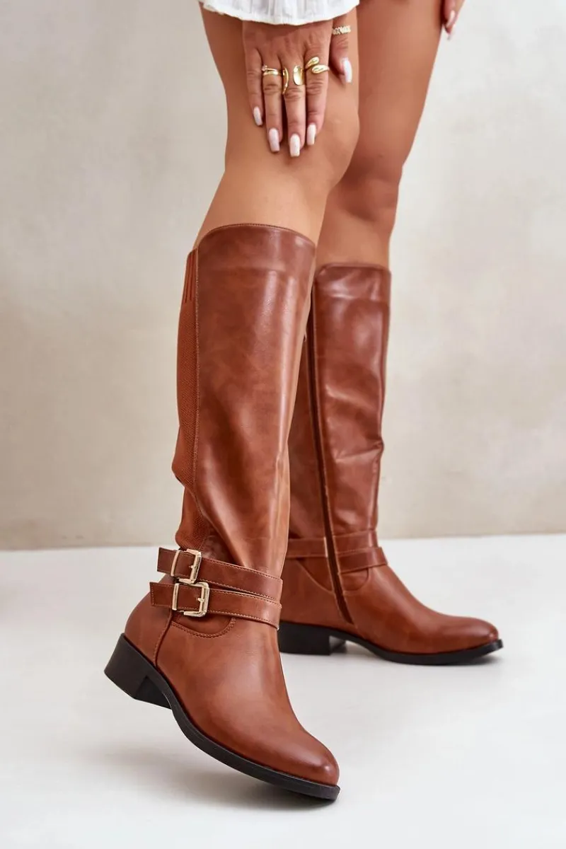Damskie kozaki o klasycznym kroju, wykonane z eko skóry. Osadzone na płaskim obcasie, co zapewnia wygodę noszenia na co dzień. Noski zaokrąglone, a cholewka sięga przed kolano, dodając elegancji i wydłużając sylwetkę. Zapinane na zamek, ułatwiający zakładanie. Dodatkowym atutem są ozdobne paski ze złotymi klamrami, które nadają wyjątkowego charakteru. Przy wyborze rozmiaru prosimy sugerować się tabelą rozmiarów.