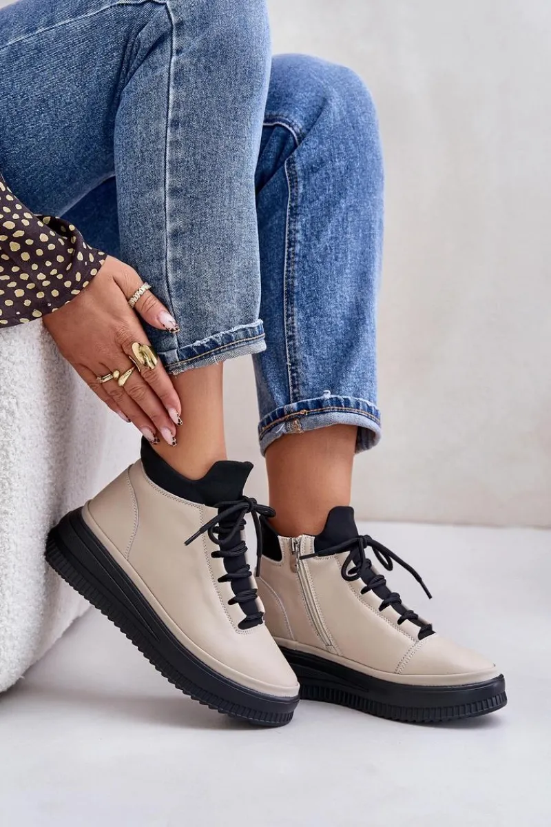 Sportowe buty wykonane z wysokiej jakości skóry naturalnej, które łączą styl z wygodą. Osadzone na modnej platformie, która dodaje charakteru i podkreśla nowoczesny design. Model zapinany na zamek, a dodatkowe sznurowanie pozwala na idealne dopasowanie do stopy. Zaokrąglone noski nadają całości subtelnego wyglądu. Te buty to must-have dla każdej kobiety, która ceni sobie zarówno modny wygląd, jak i komfort. Przy wyborze rozmiaru prosimy sugerować się tabelą rozmiarów.
