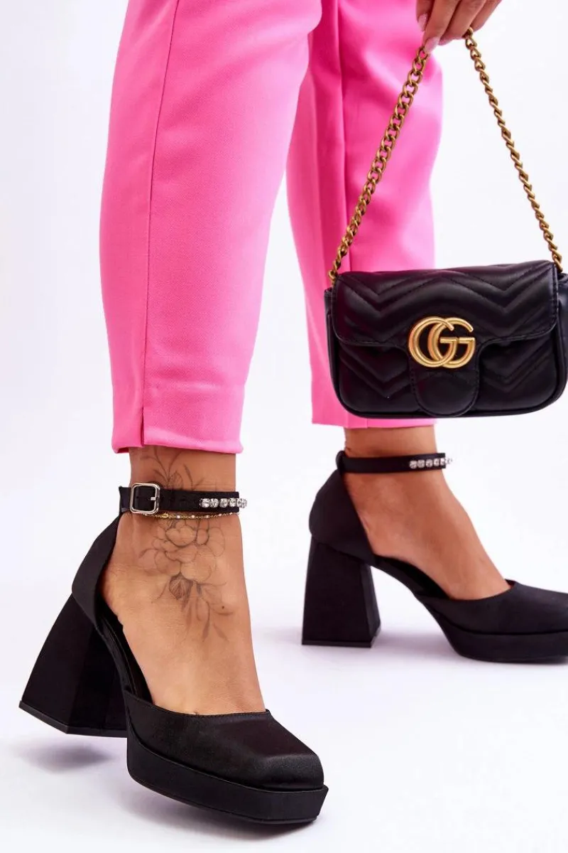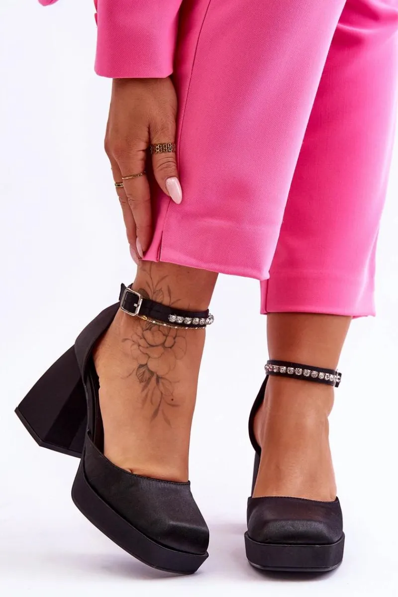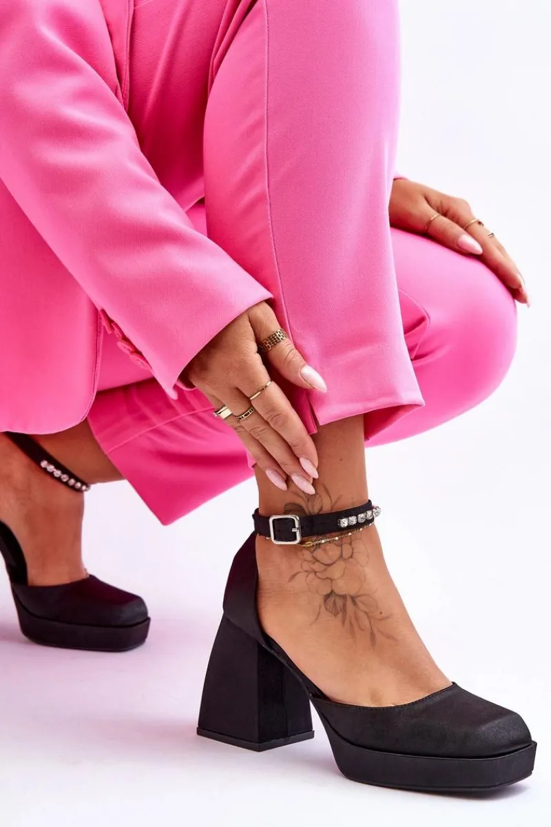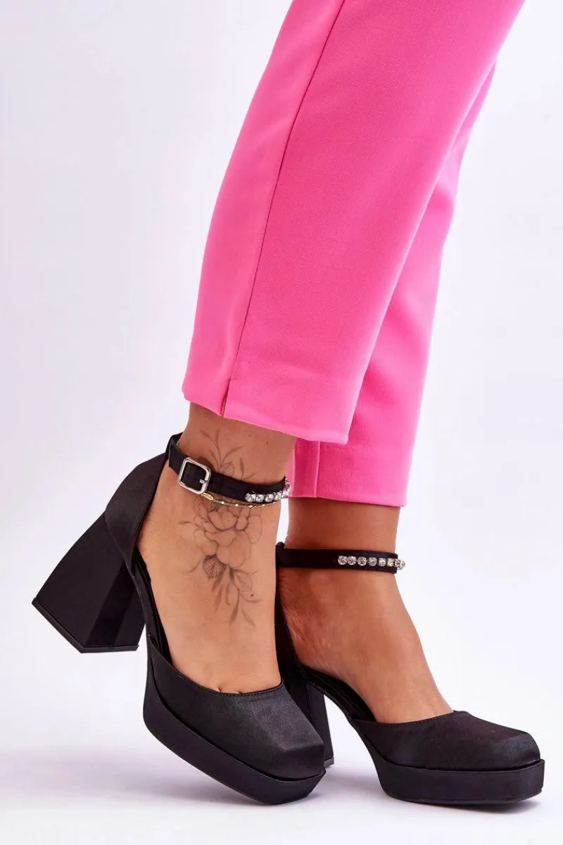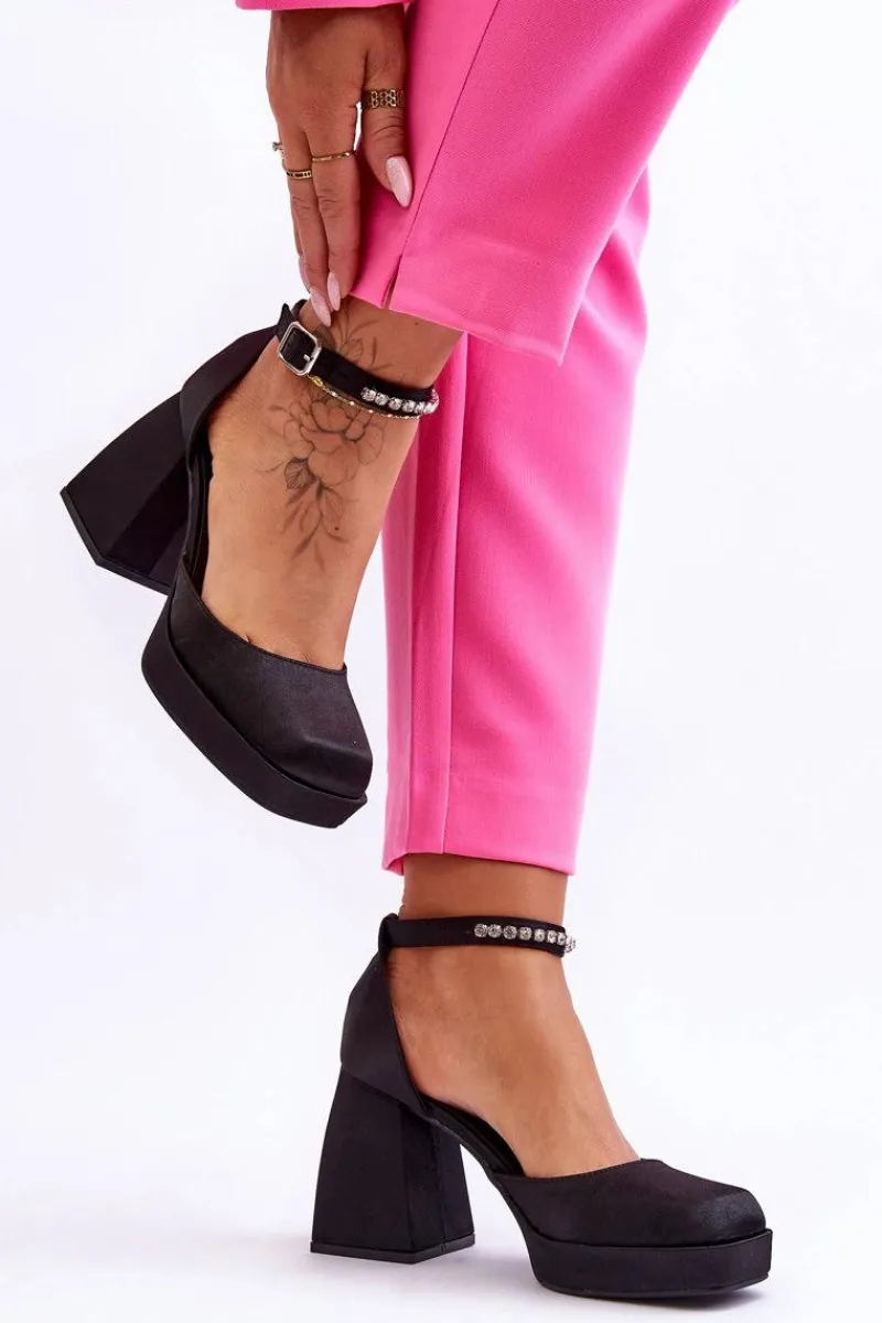 Czółenka zostały wykonane z materiału tekstylnego. Osadzone na platformie oraz obcasie w postaci stabilnego, masywnego klocka. Miękka wkładka z eko skóry zapewni komfortowe użytkowanie. Czółenka są zapinane na regulowany pasek ze sprzączką, który został dodatkowo ozdobiony dżetami imitującymi cyrkonie. Zapiętek został usztywniony. Przy wyborze rozmiaru prosimy sugerować się tabelą rozmiarów.