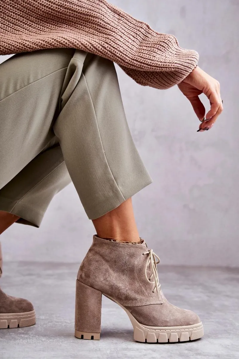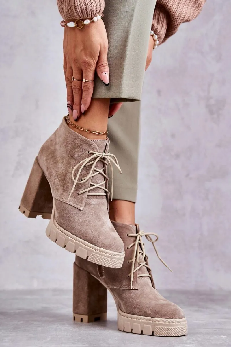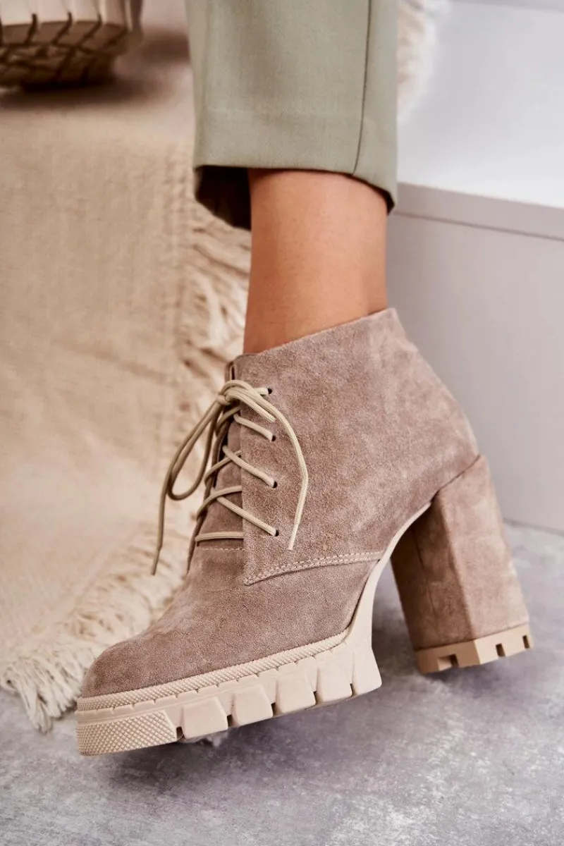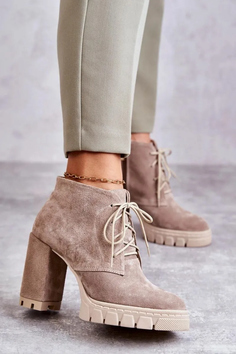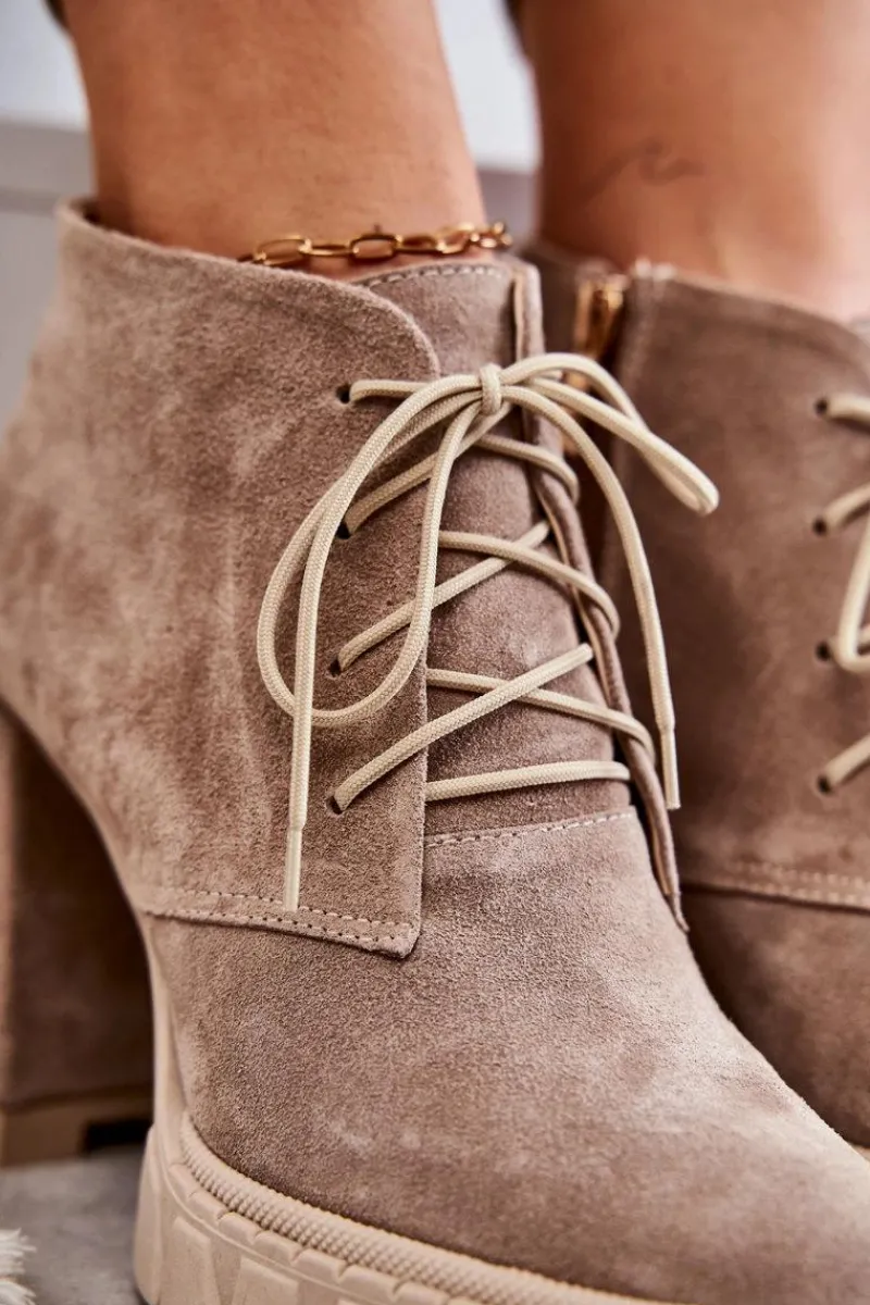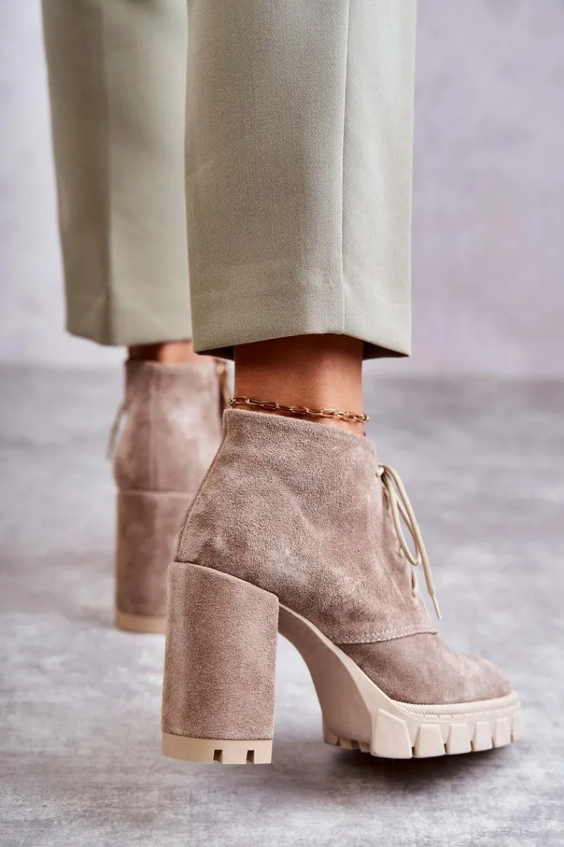 Cudowne botki damskie zostały wykonane z najwyższej jakości naturalnych skór z dbałością o szczegóły. Model ten posiada klasyczne sznurowanie oraz suwak z boku cholewki. Dodatkowo zapiętek w tych botkach jest usztywniany. Osadzono je na obcasie w postaci słupka oraz platformie. Miękka wkładka wykonana z naturalnej skóry zapewni komfort podczas użytkowania. Przy wyborze rozmiaru prosimy sugerować się tabelą rozmiarów.