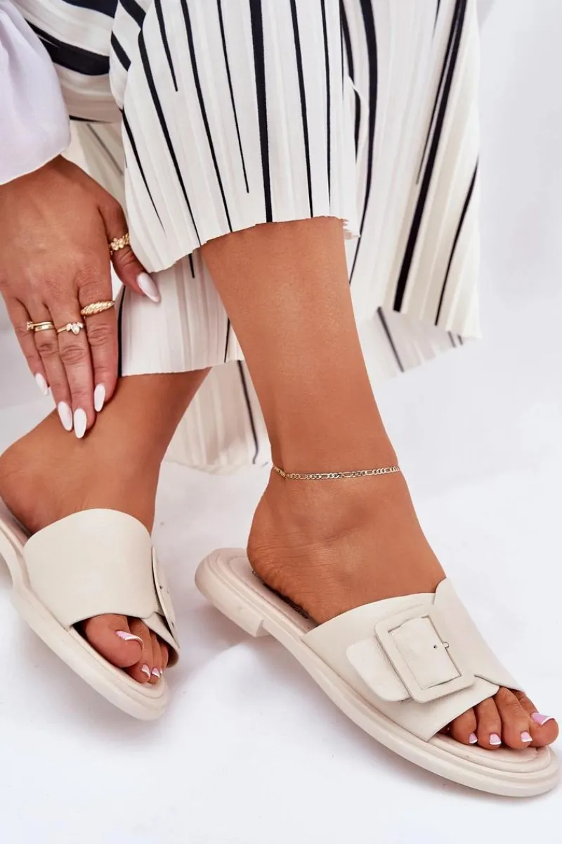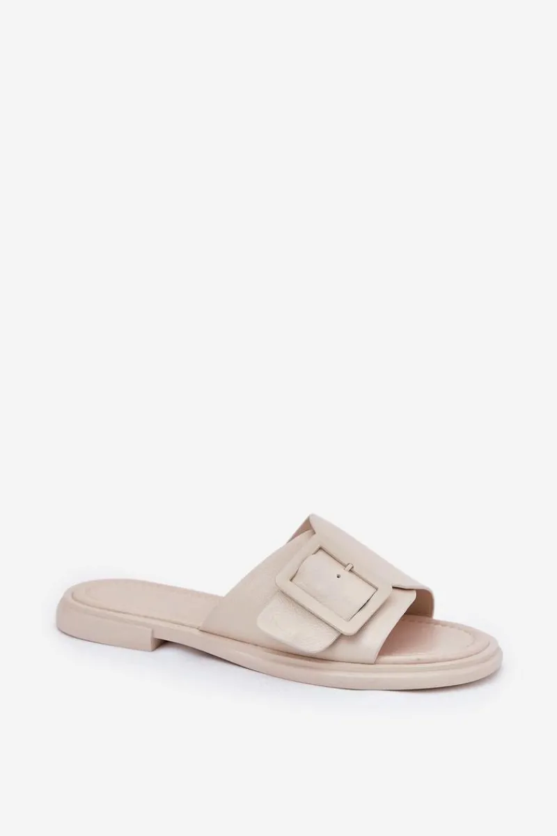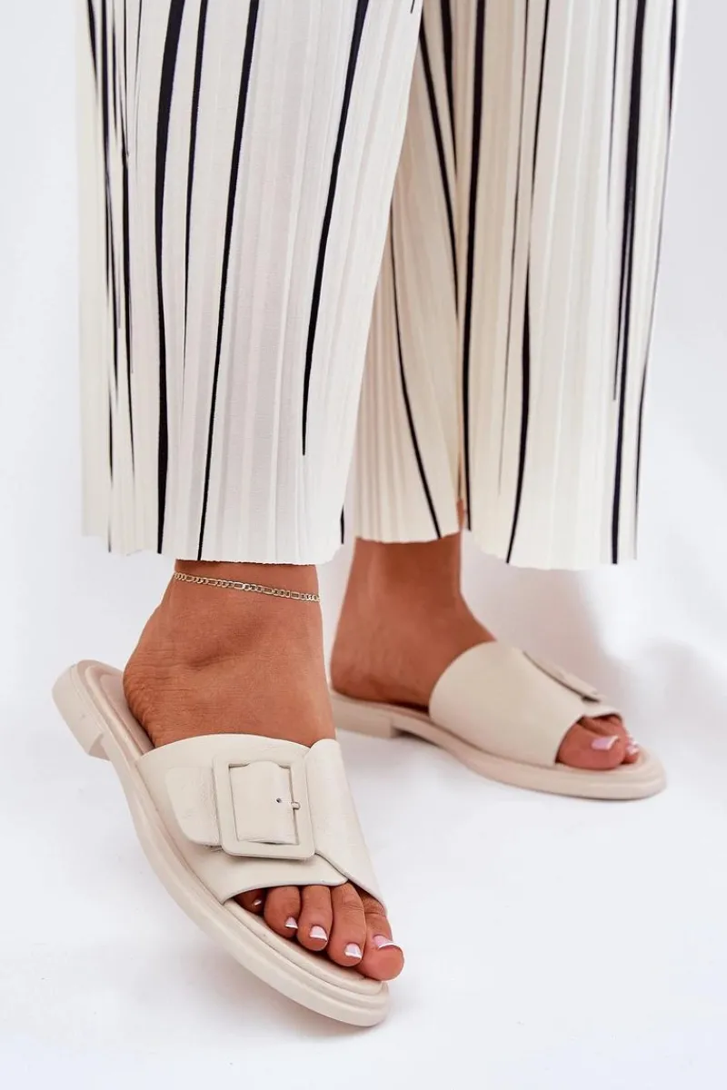 Eleganckie klapki damskie z naturalnej skóry, osadzone na płaskim obcasie, które łączą komfort z prostym stylem. Z przodu duża klamra, która dodaje im wyjątkowego charakteru. Skórzana wkładka zapewnia wygodę przez cały dzień, dbając o odpowiednią amortyzację. Doskonałe na letnie dni, te klapki będą idealnym wyborem do codziennych stylizacji, wprowadzając do nich lekkość i elegancję. Przy wyborze rozmiaru prosimy sugerować się tabelą rozmiarów.