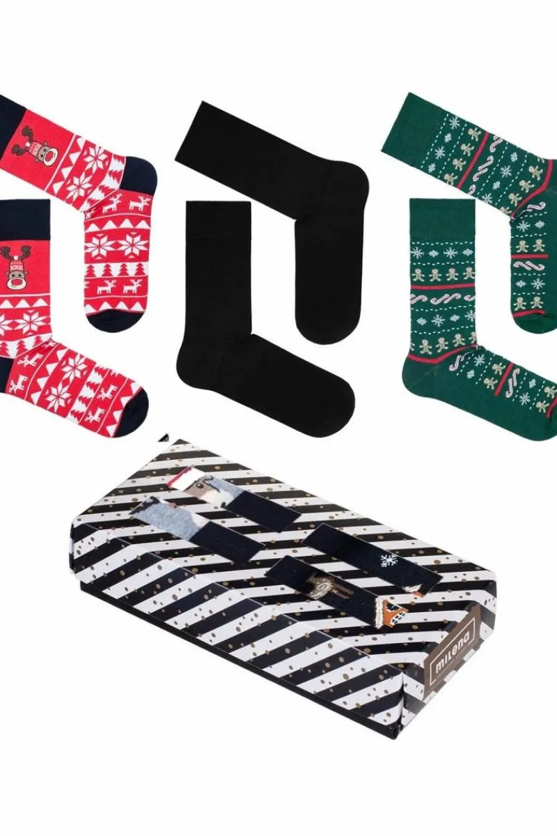 Zestaw świąteczny męski to 3 par skarpetek świątecznych męskich. Oczywiście specjalnie dla Was zapakowaliśmy je w estetyczne kartonowe pudełko z okienkiem. W zestawie znajdują się dwie pary skarpetek w wesoły, świąteczny wzór oraz jedna gładka skarpetka garniturowa.