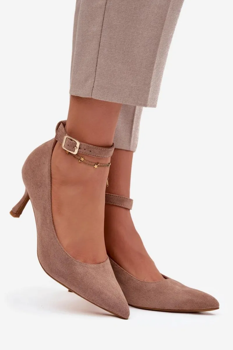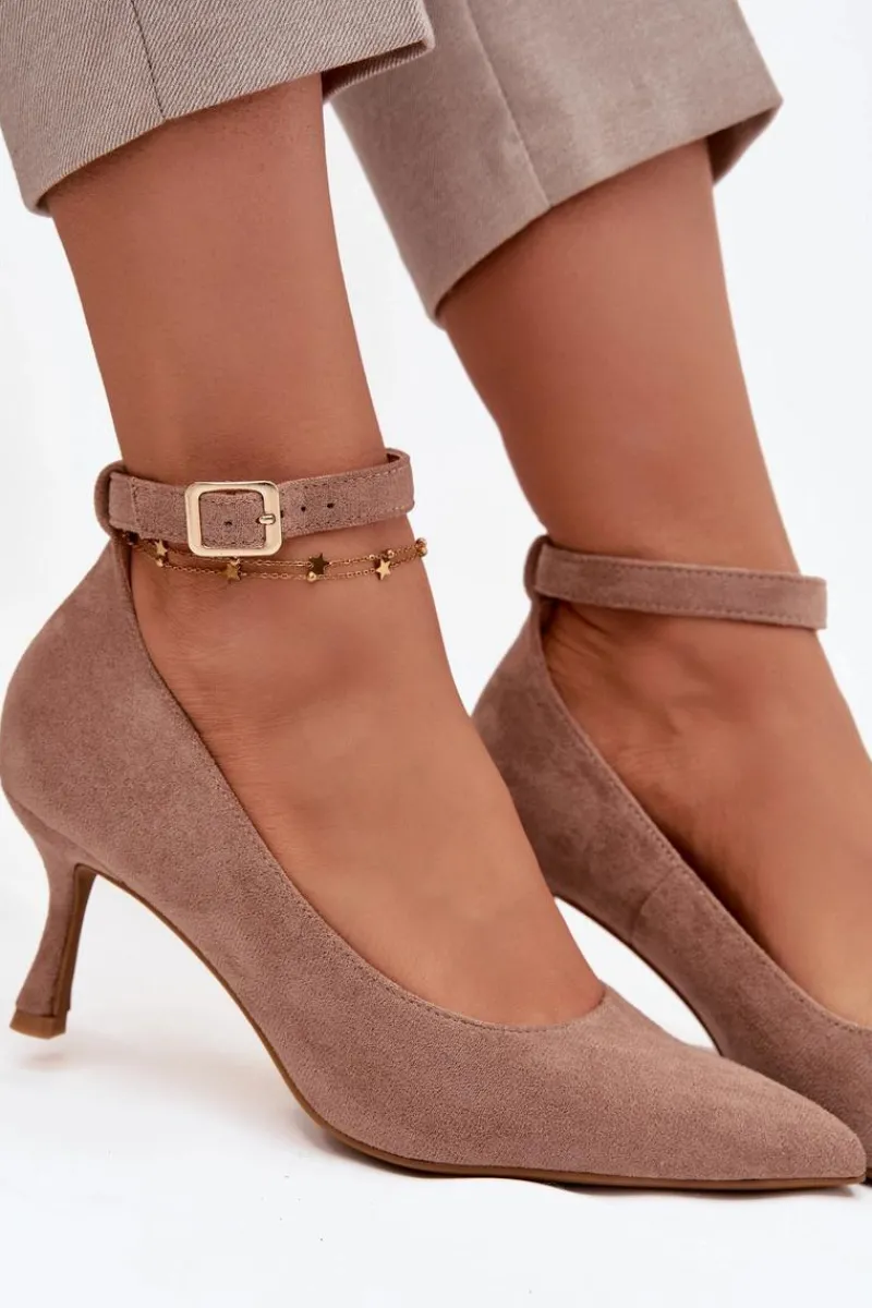 Czółenka – szpilki damskie wykonane z miękkiego eko zamszu. Model zachwyca klasycznym fasonem ze szpiczastym noskiem, który optycznie wysmukla nogi i dodaje sylwetce lekkości. Buty zapinane wokół kostki na regulowany pasek ze sprzączką pięknie podkreślają stopę, zapewniając jednocześnie stabilność i komfort podczas noszenia. Te czółenka doskonale sprawdzą się zarówno w stylizacjach wieczorowych, jak i eleganckich zestawach na co dzień.