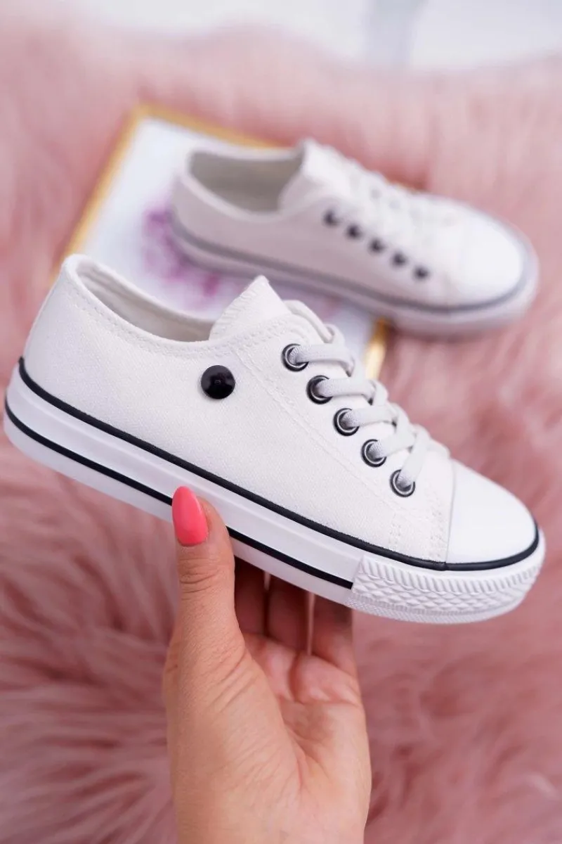 Klasyczne trampki wykonane z materiału tekstylnego. Ponadczasowy wzór w wersji młodzieżowej. Zastosowanie gumowego noska sprawia że buciki pięknie wyglądają oraz są bardziej odporne na uszkodzenia. Zakładanie i dopasowanie do stopy ułatwią elastyczne gumki. Przy wyborze rozmiaru prosimy sugerować się tabelą rozmiarów dostępną po najechaniu bądź kliknięciu na dany rozmiar.