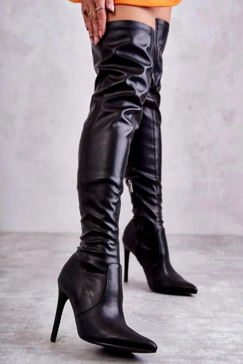 Eleganckie kozaki damskie z cholewką za kolano. Zostały wykonane z eko skóry. Model osadzony na obcasie w postaci szpilki. Nosek w szpic oraz obcas optycznie wysmukli nogi. Kozaki posiadają delikatne ocieplenie w postaci koca obuwniczego. Z boku cholewki znajduje się suwak oraz delikatne przeszycia. Model idealny do krótkich sukienek oraz spódniczek. Przy wyborze rozmiaru prosimy sugerować się tabelą rozmiarów.