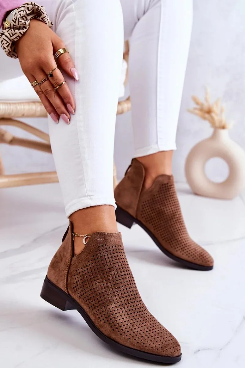 Botki wykonane z eko zamszu w ażurowy wzór idealnie pasują do wielu kobiecych stylizacji. Wewnątrz wkładka została wykonana z eko skóry. Zakładanie ułatwi wszyty z tyłu suwak. Płaski obcas zapewni stabilność. Świetnie sprawdzą się w sezonie wiosenno-letnim. Koniecznie musisz je mieć! Przy wyborze rozmiaru prosimy sugerować się tabelą rozmiarów.