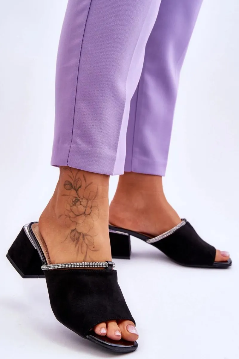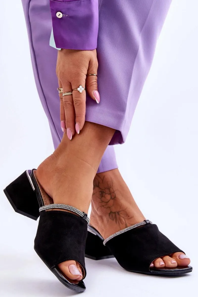 Niezwykle modne, damskie klapki z pewnością sprawdzą się w sezonie letnim w wielu sytuacjach! Zostały wykonane z miłego w dotyku eko zamszu. Klapki posiadają wykonaną z naturalnej skóry wkładkę. Dodatkowo zostały ozdobione paseczkiem z dżetami. Osadzone na obcasie w postaci klocka. Przy wyborze rozmiaru prosimy kierować się tabelą rozmiarów.