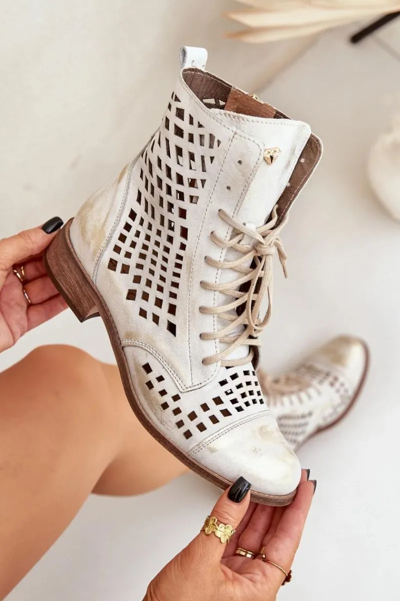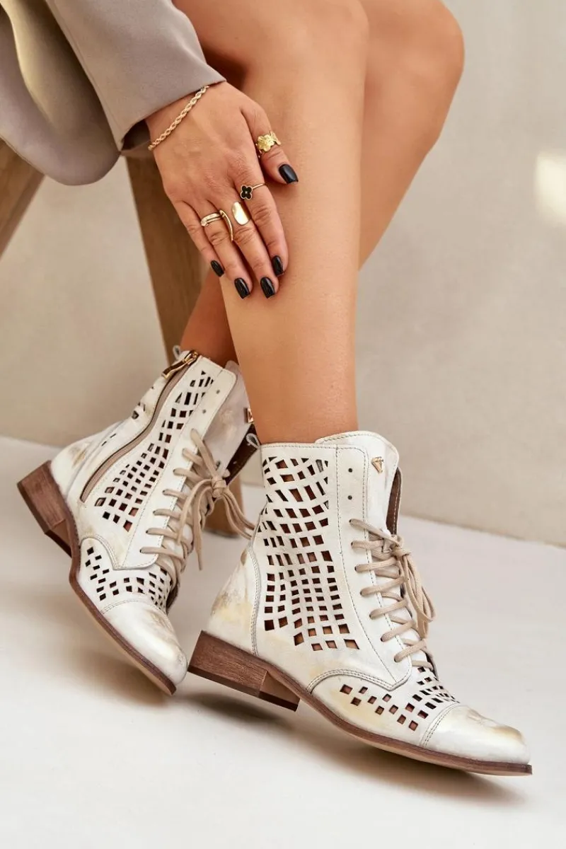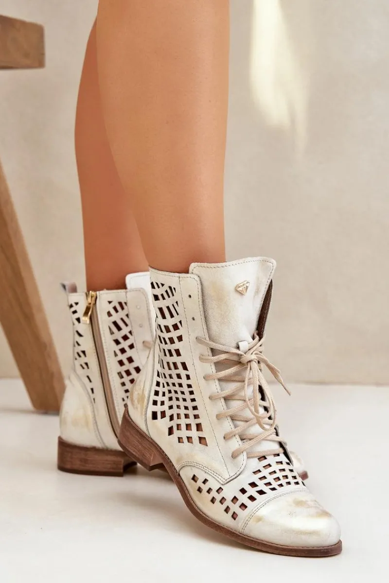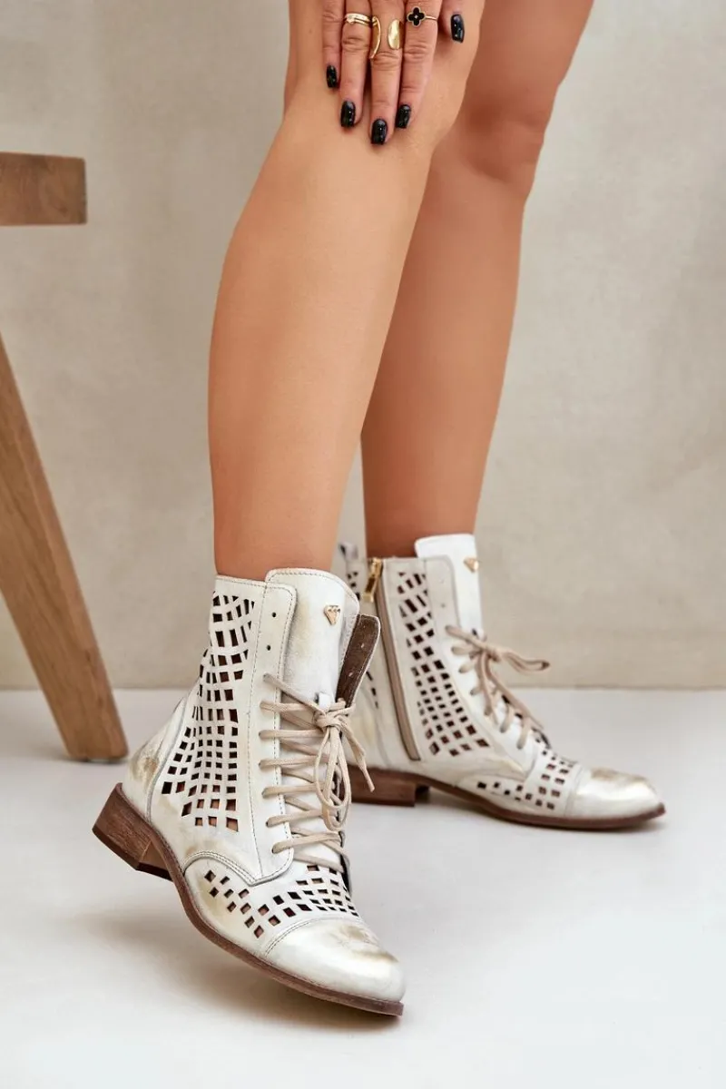 Online Zazoo 2627 Ażurowe Skórzane Botki Złoty Przecierany
