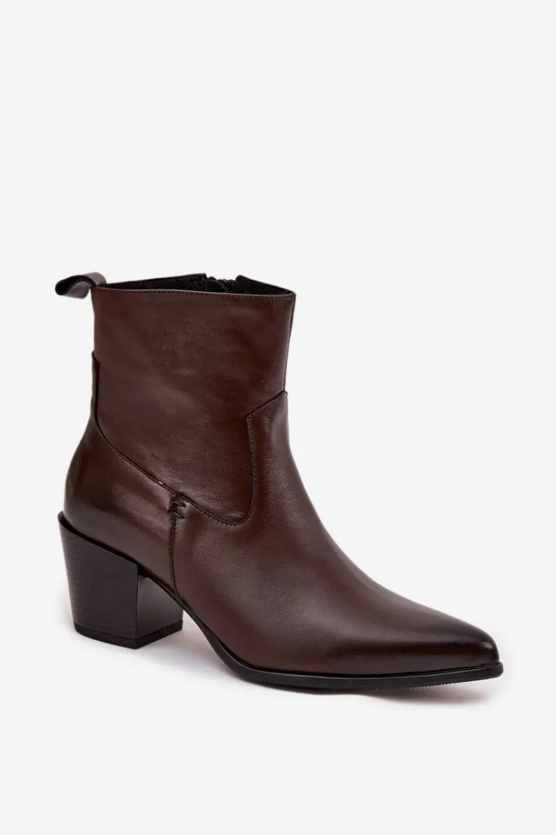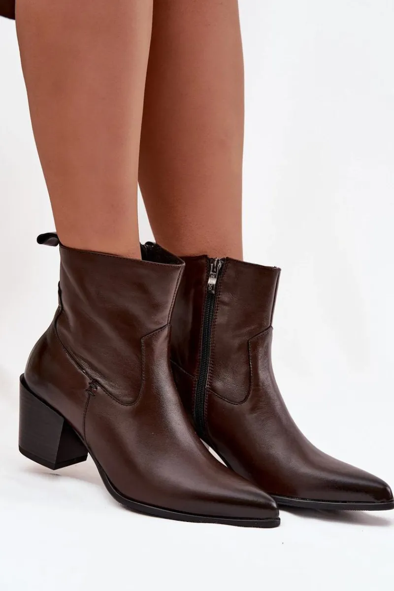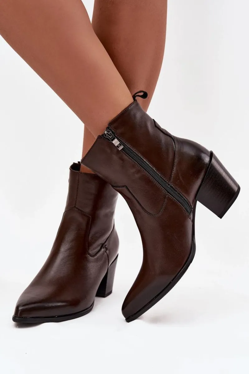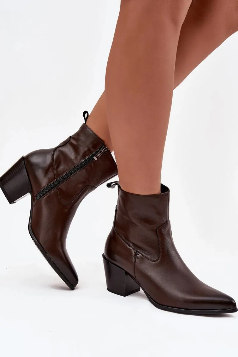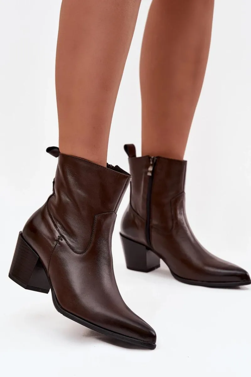Botki kowbojki damskie z naturalnej skóry to stylowe obuwie, które łączy wygodę z charakterystycznym westernowym akcentem. Wykonane z wysokiej jakości skóry naturalnej zachwycają trwałością i estetyką, a jednocześnie zapewniają komfort podczas codziennego użytkowania. Model zapinany jest na zamek, który ułatwia zakładanie i zdejmowanie butów. Szpiczaste noski oraz ścięty obcas w formie słupka nadają całości wyjątkowego charakteru, podkreślając smukłą linię stopy. Ocieplane wnętrze gwarantuje ciepło w chłodniejsze dni, co sprawia, że botki sprawdzą się idealnie w sezonie jesienno-zimowym. To uniwersalny model, który doskonale pasuje zarówno do jeansów i ramoneski, jak i do zwiewnych sukienek, wnosząc do stylizacji nutę kobiecej swobody i nowoczesnej elegancji.Przy wyborze rozmiaru prosimy sugerować się tabelą rozmiarów.
