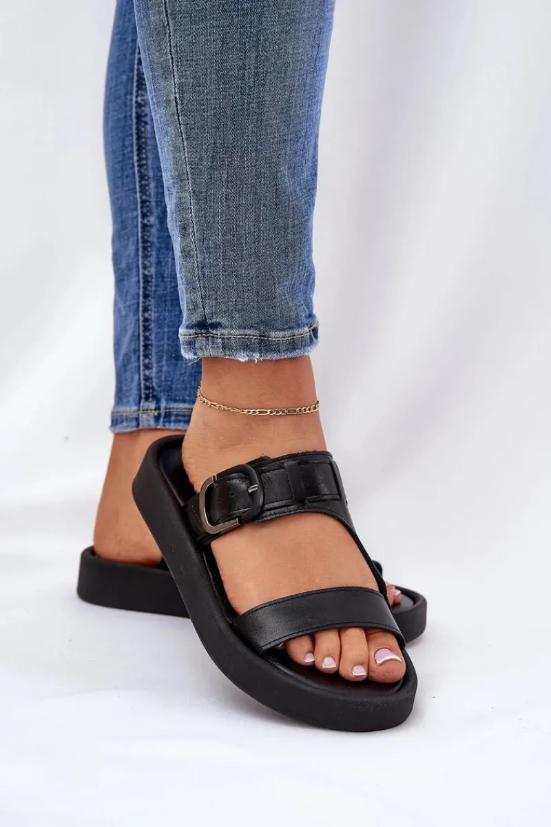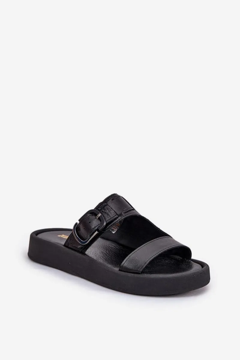 Damskie klapki wykonane z naturalnej skóry. Osadzone na platformie. Doskonałe na letnie dni, te klapki znakomicie uzupełnią każdą stylizację, łącząc modny wygląd z praktycznością. Pasek z klamrą zapewnia dodatkową regulację, a miękka wkładka skórzana gwarantuje komfort noszenia. Przy wyborze rozmiaru prosimy sugerować się tabelą rozmiarów.