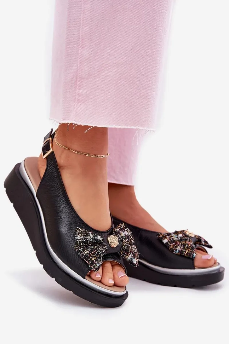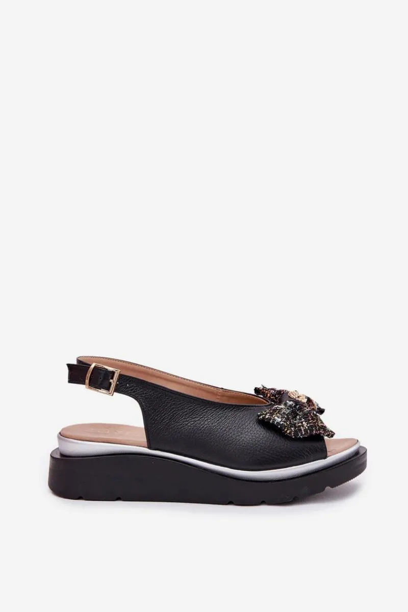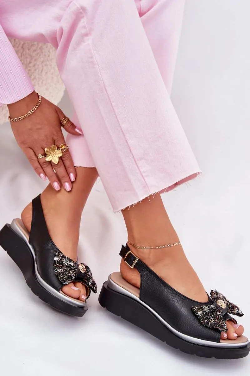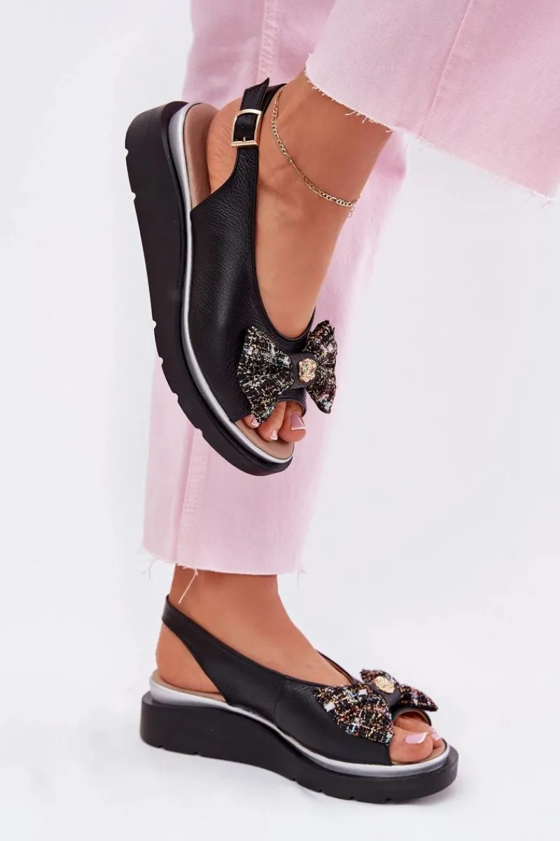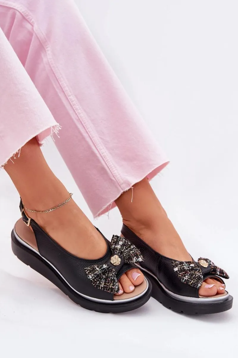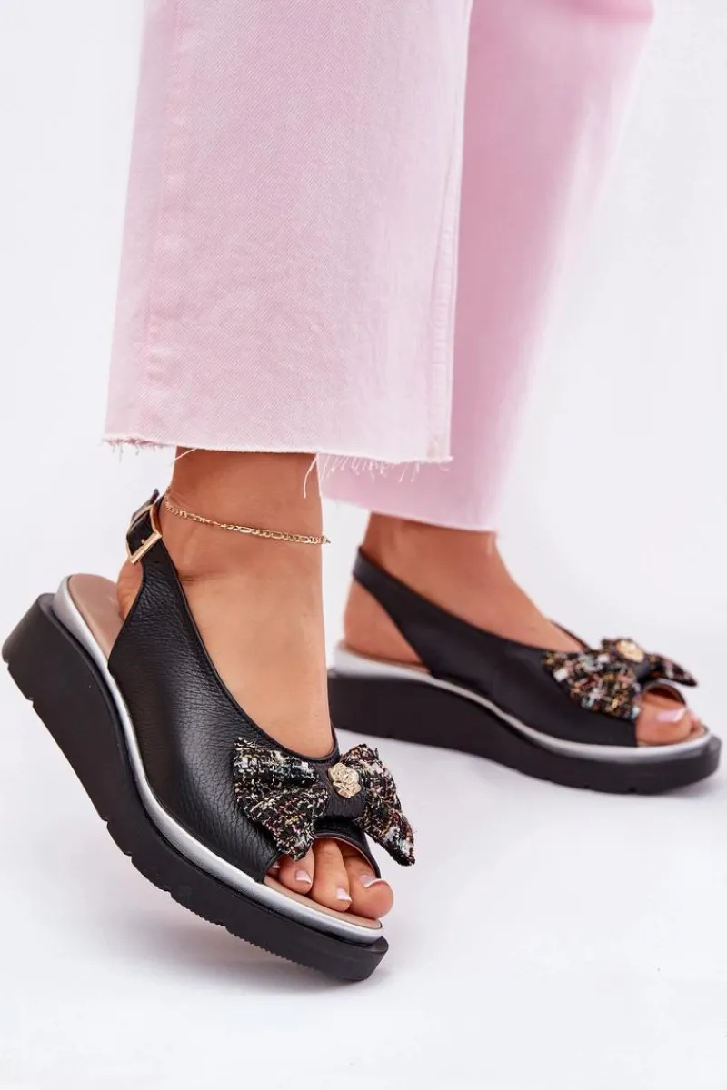 Sandały damskie z naturalnej skóry, osadzone na koturnie, to elegancka i wygodna opcja na letnie dni. Zapinane na klamrę z regulowanym paskiem, zapewniają doskonałe dopasowanie do stopy. Z przodu znajdują się urocza kokardka ze złotym detalem, która dodaje im subtelnego uroku. Doskonałe do sukienek, spódnic czy spodni, łączą komfort z modnym wyglądem. Idealne na codzienne wyjścia oraz specjalne okazje. Przy wyborze rozmiaru prosimy kierować się tabelą rozmiarów.
