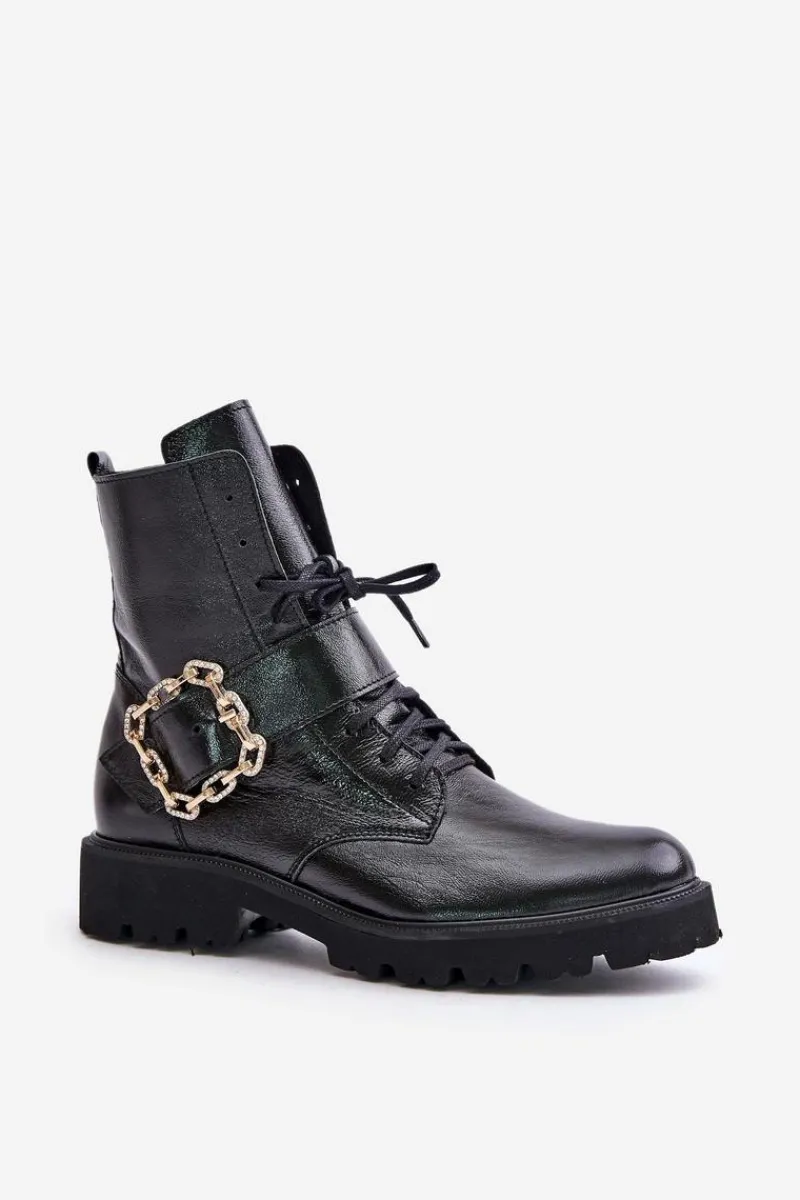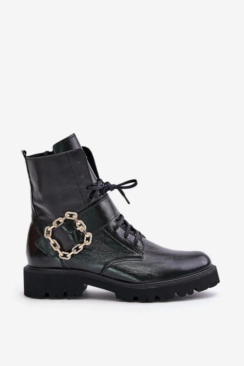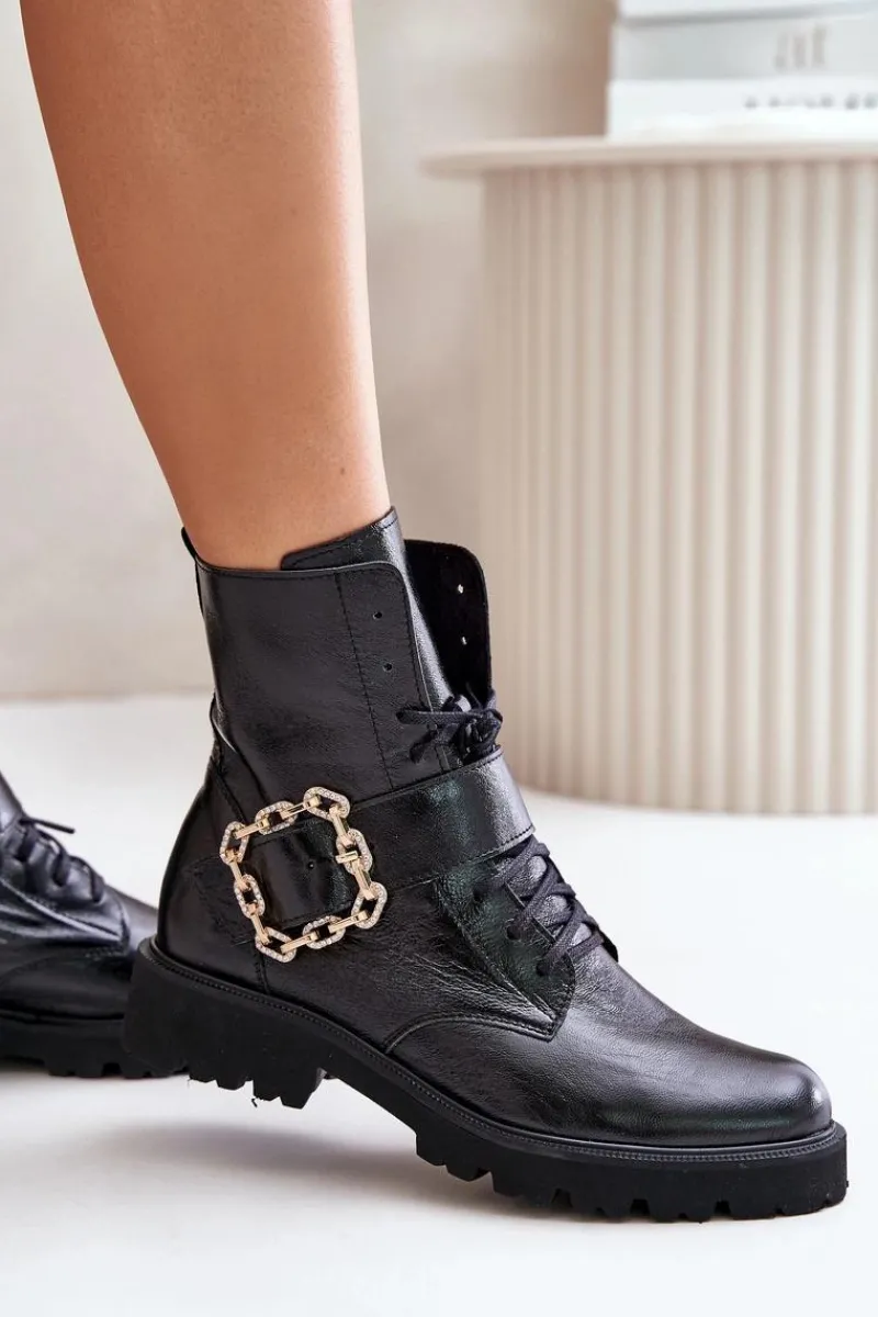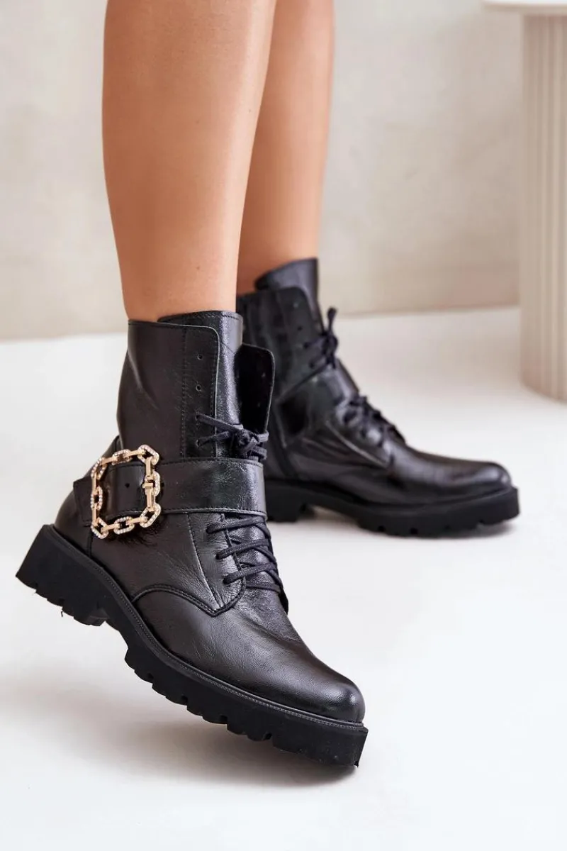 Botki damskie wykonane z wysokiej jakości naturalnej skóry. Osadzone na płaskim obcasie, co sprawia, że są niezwykle wygodne i stabilne. Zapinane na suwak z boku cholewki oraz sznurowane. Głównym atutem tego modelu jest ozdobna klamra, która nadaje wyjątkowego uroku. Noski zaokrąglone. Koniecznie powinnaś je mieć! Przy wyborze rozmiaru prosimy sugerować się tabelą rozmiarów.