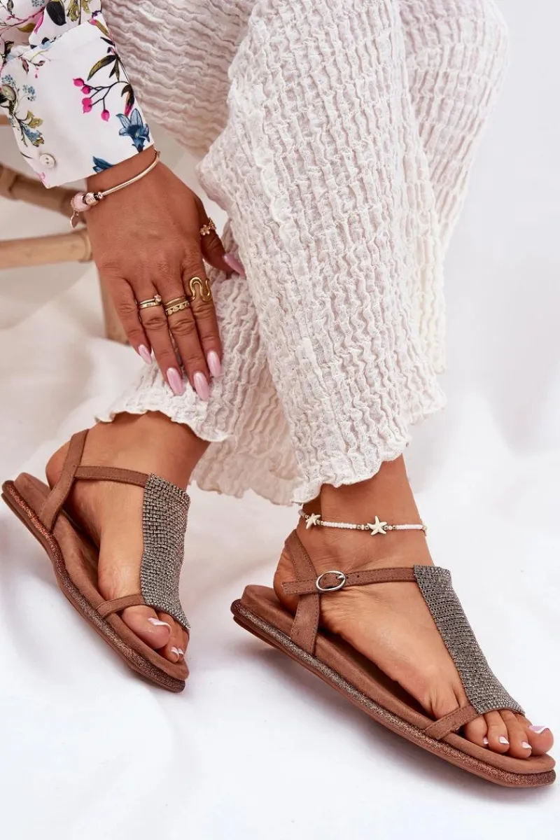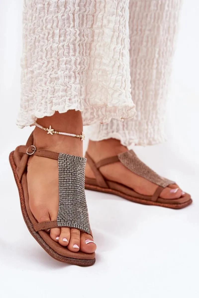 Eleganckie płaskie sandały damskie to perfekcyjny wybór na wyjątkowe okazje. Zapinane na sprzączkę z regulowanym paskiem, zapewniają idealne dopasowanie do stopy. Model wyróżnia się efektownym paskiem ozdobionym kryształkami, które dodają im szyku i blasku. Miękka, eko skórzana wkładka gwarantuje komfort przez cały dzień. Te sandały będą doskonałym uzupełnieniem eleganckich stylizacji na uroczystości i wieczorne wyjścia. Przy wyborze rozmiaru prosimy sugerować się tabelą rozmiarów.