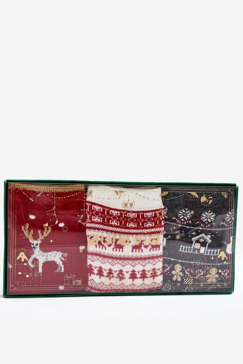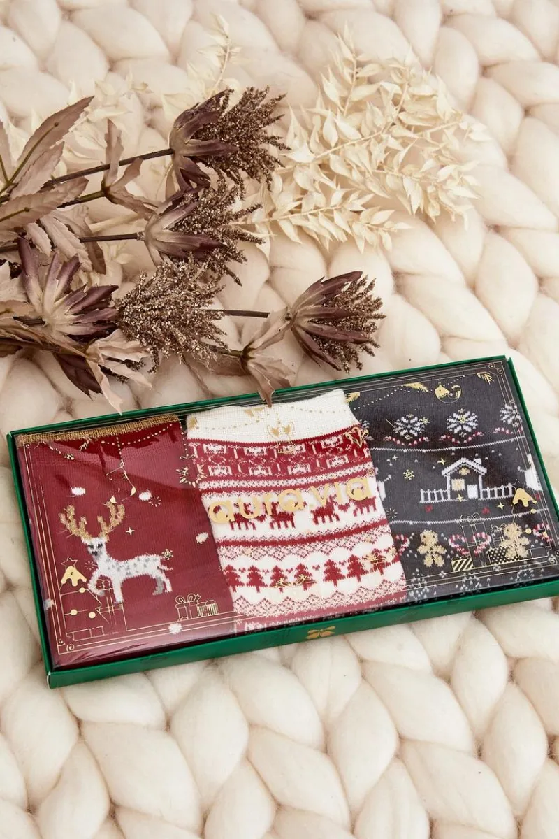Świetny zestaw trzech par damskich skarpet w świąteczne wzory. Idealny prezent na święta dla każdego! Wykonane z wysokiej jakości bawełny. Posiadają delikatny ściągacz, który odpowiednio dopasuje się do tęgości nogi.
