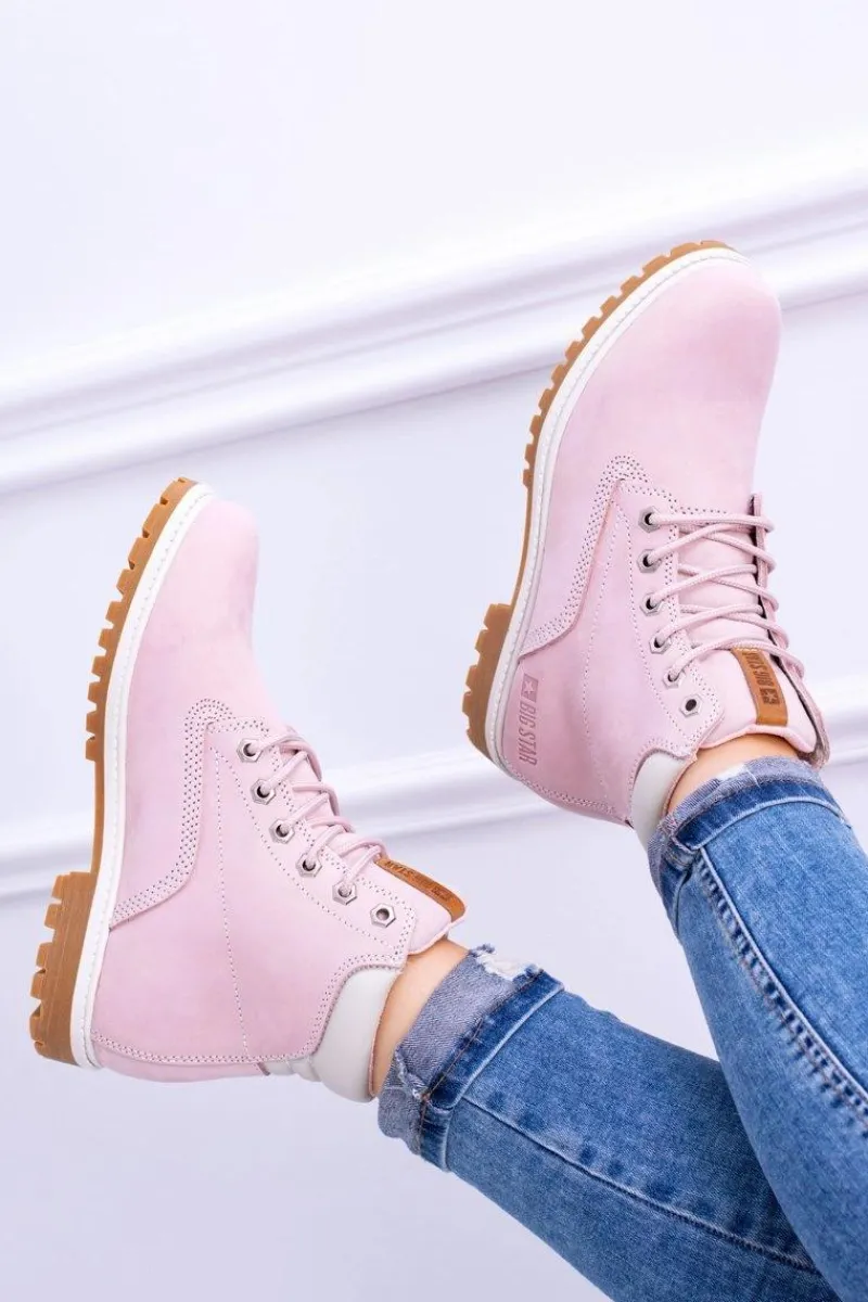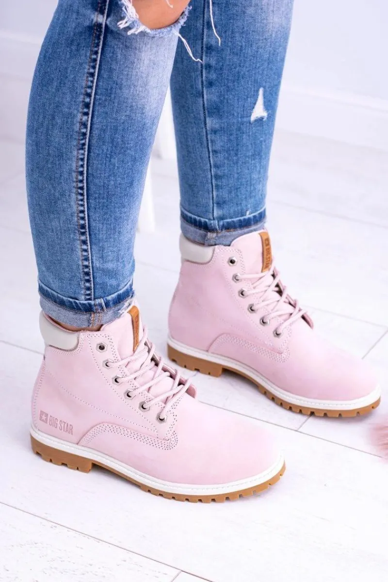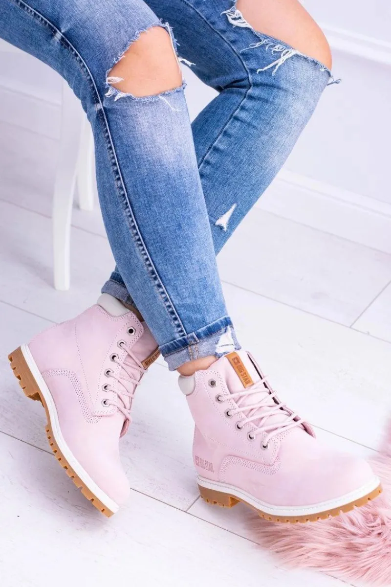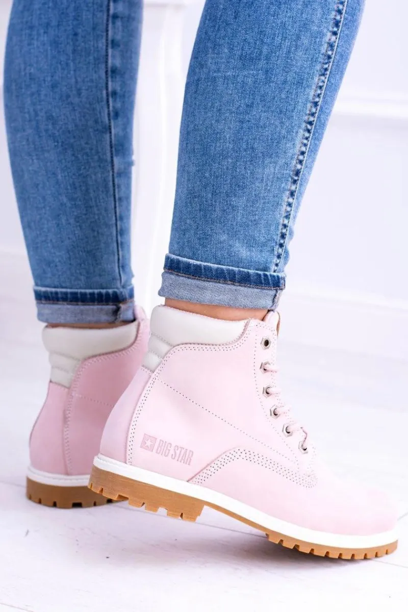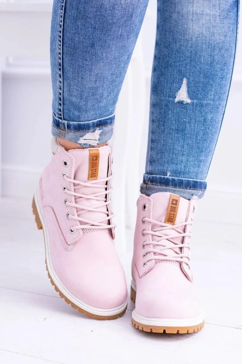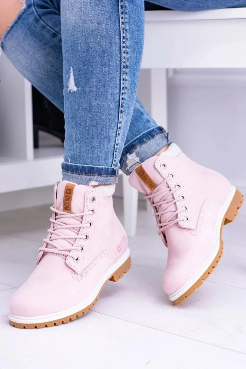 Outlet Big Star Botki Damskie Timberki Traperki Pudrowy Róż Timon Damskie Damskie Trapery|Botki Sznurowane