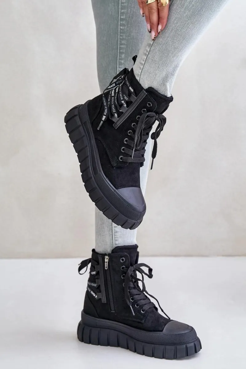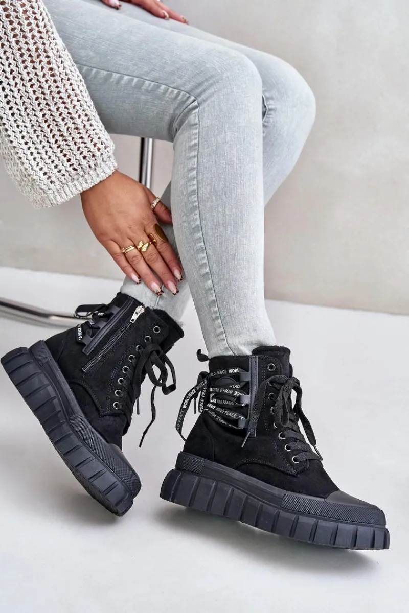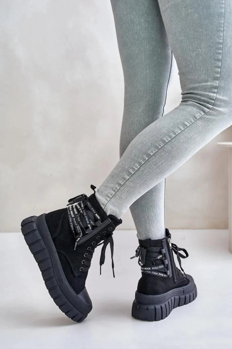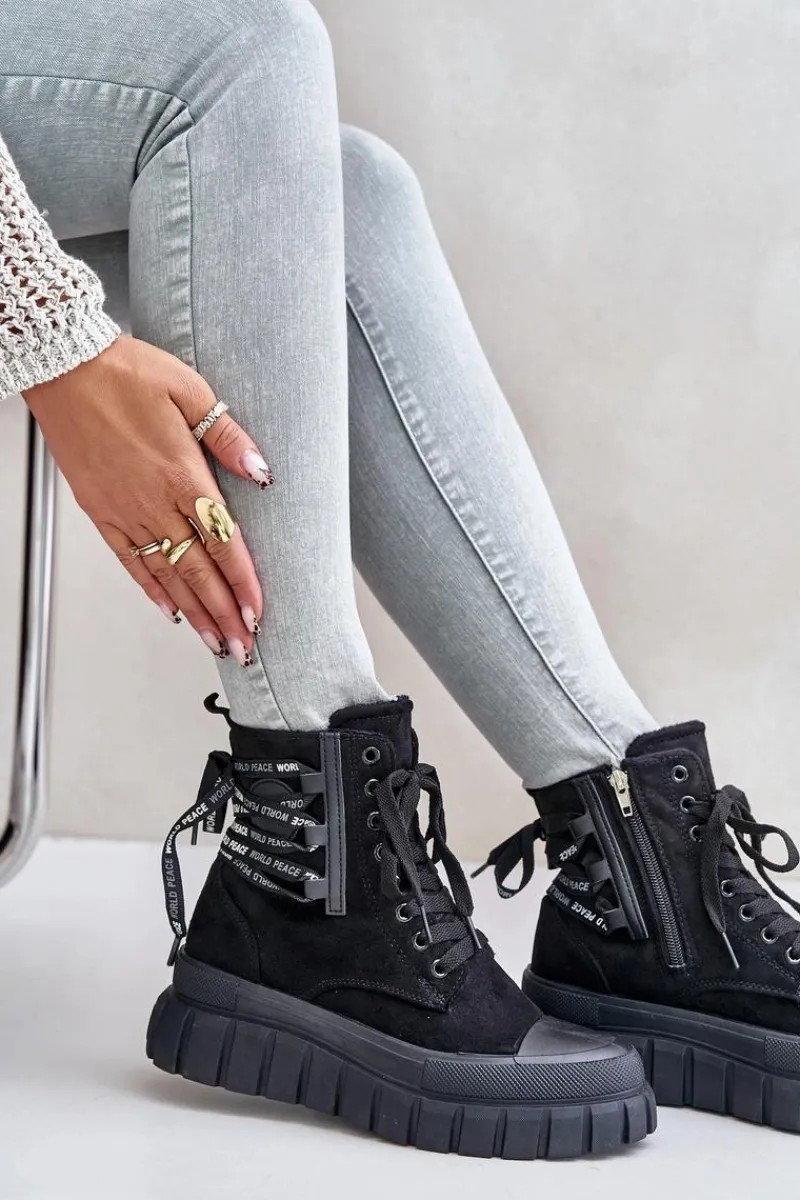 Botki damskie wykonane z eko zamszu. Zapinane na zamek oraz sznurowane. Osadzone na platformie, która doskonale odizoluje od zimnego podłoża. Noski zaokrąglone. W środku ocieplenie w postaci koca obuwniczego. Model ten wyróżnia się dodatkowym ozdobnym sznurowaniem z tyłu. Koniecznie powinnaś je mieć! Przy wyborze rozmiaru prosimy sugerować się tabelą rozmiarów.
