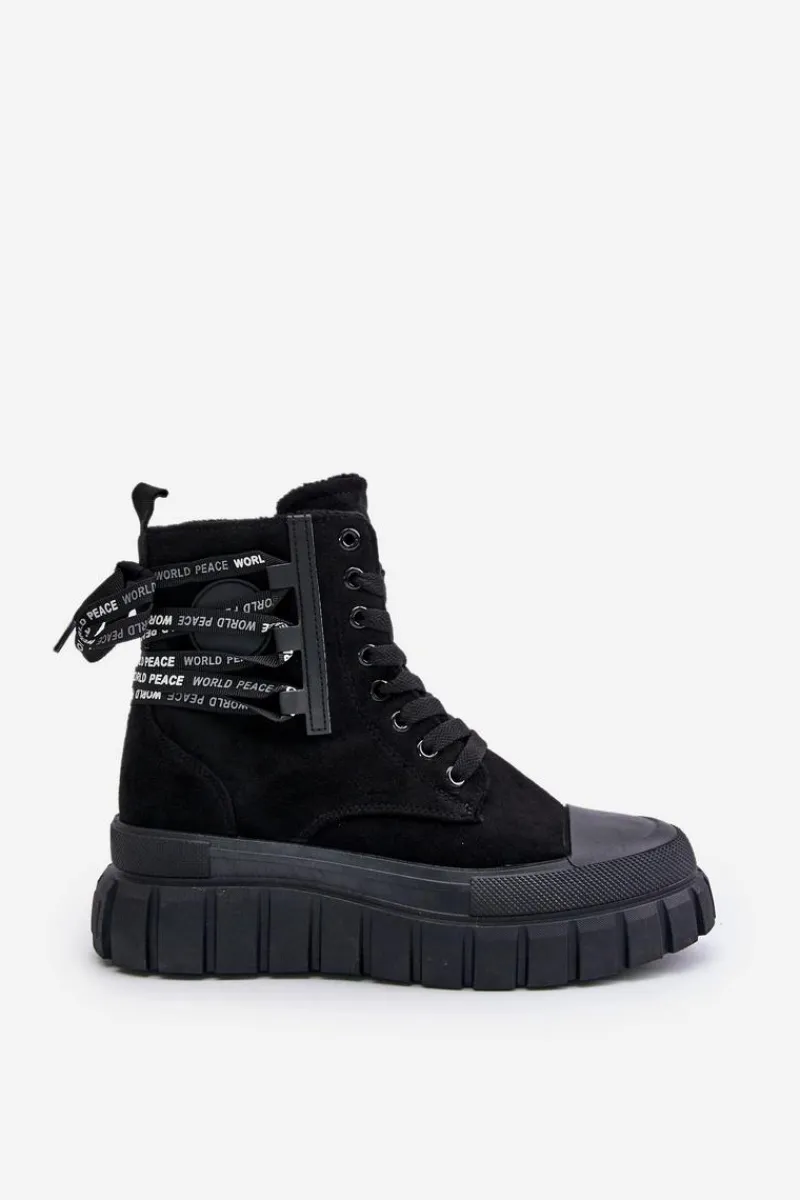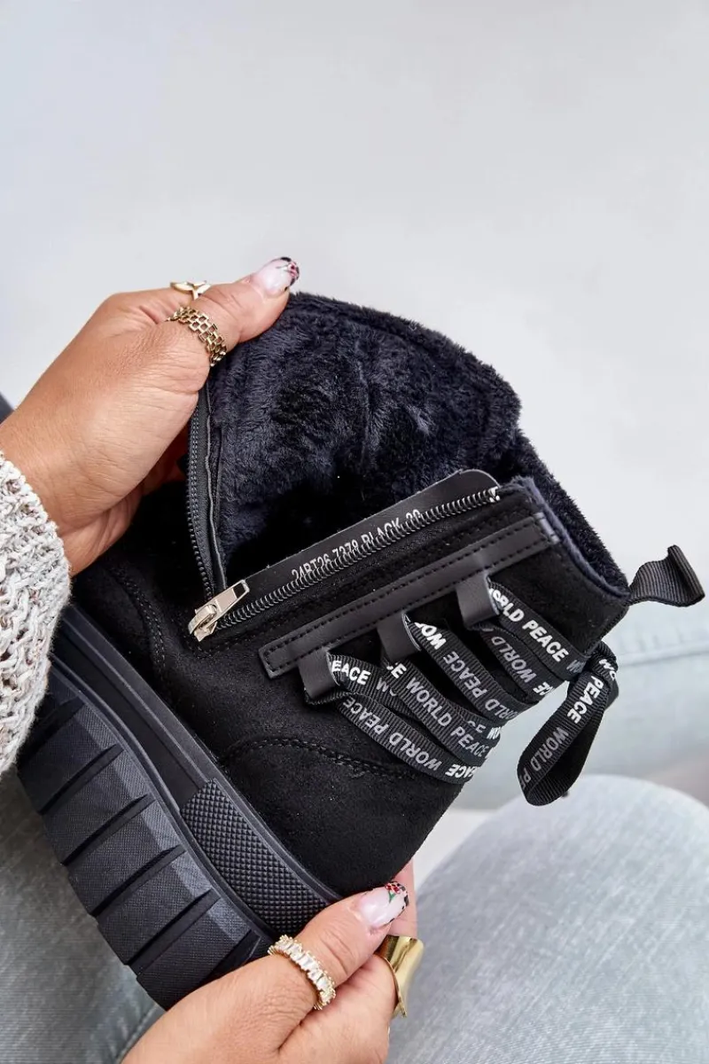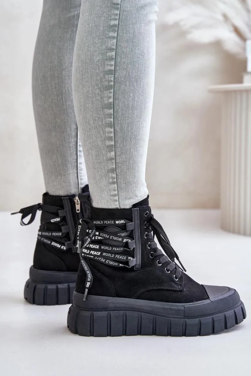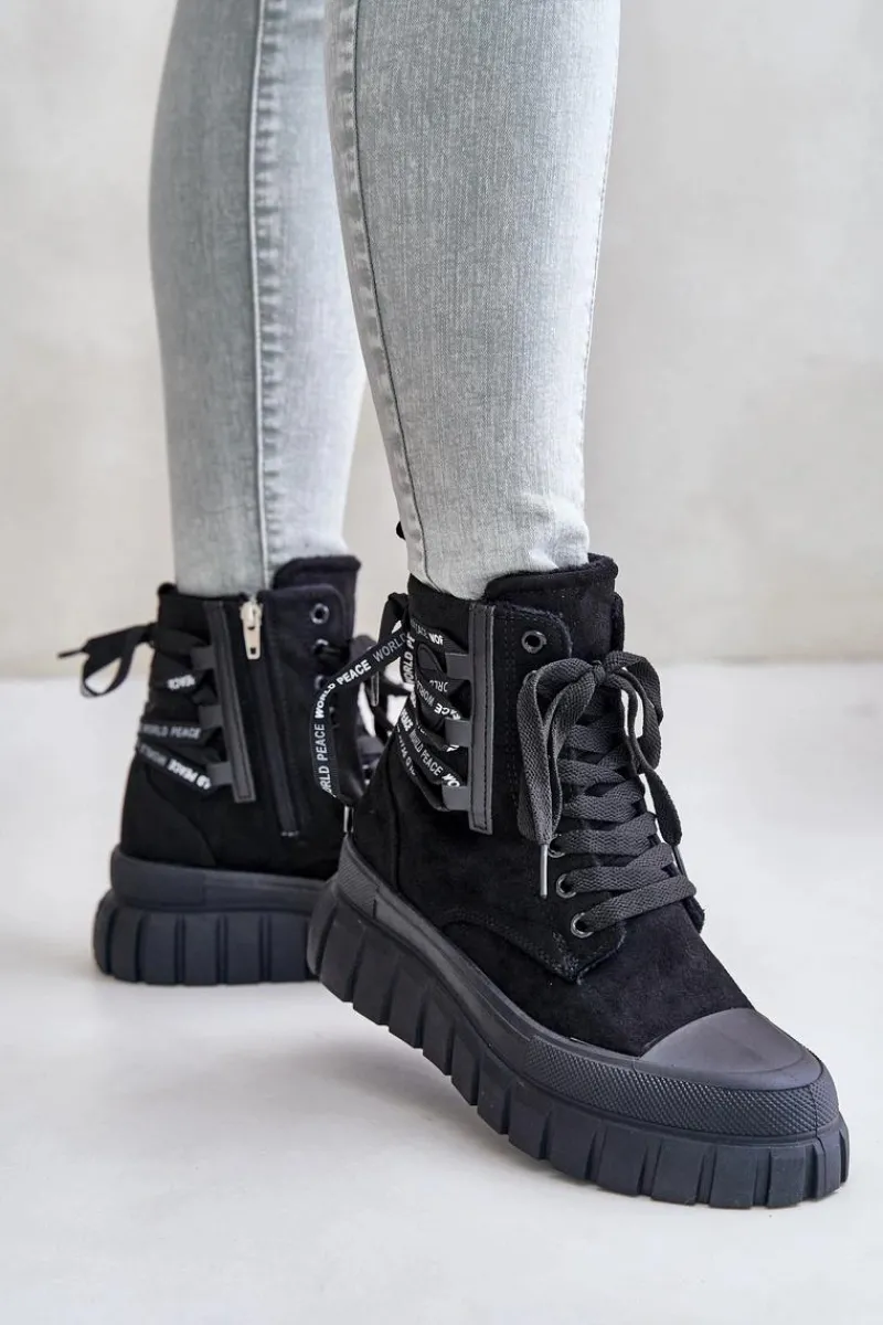 Botki damskie wykonane z eko zamszu. Zapinane na zamek oraz sznurowane. Osadzone na platformie, która doskonale odizoluje od zimnego podłoża. Noski zaokrąglone. W środku ocieplenie w postaci koca obuwniczego. Model ten wyróżnia się dodatkowym ozdobnym sznurowaniem z tyłu. Koniecznie powinnaś je mieć! Przy wyborze rozmiaru prosimy sugerować się tabelą rozmiarów.