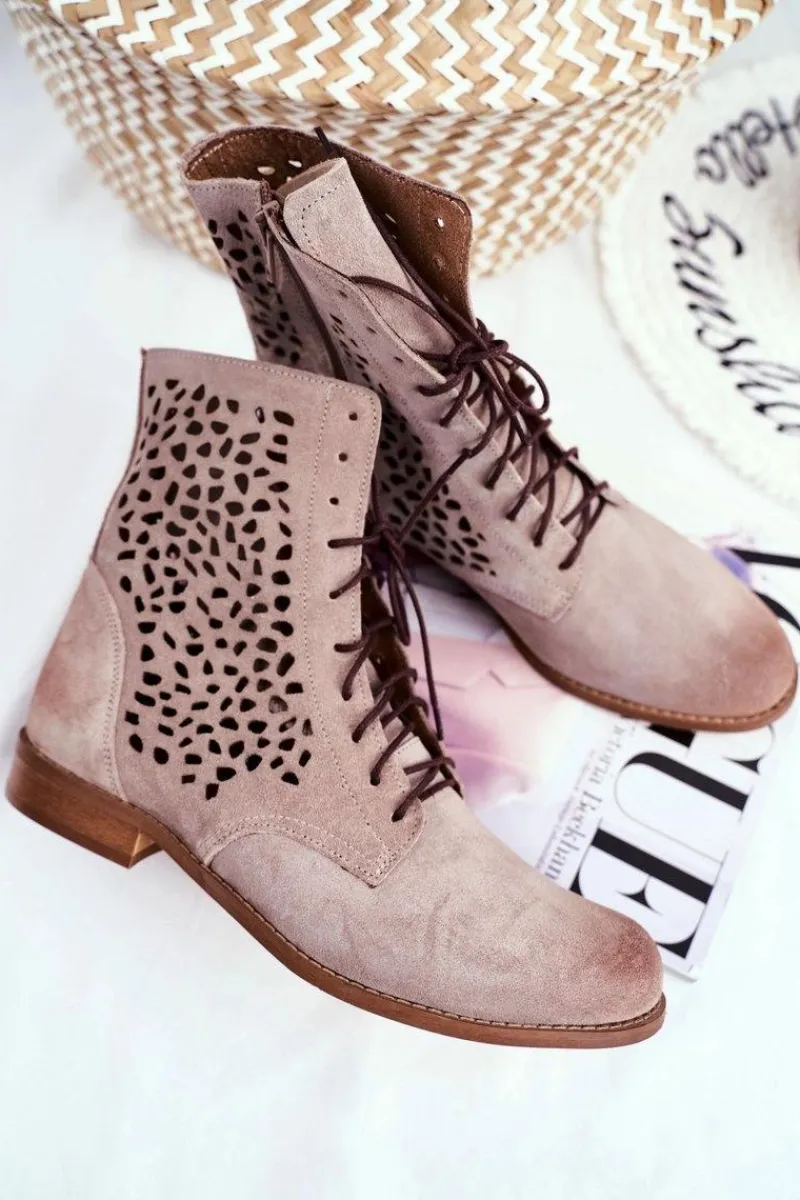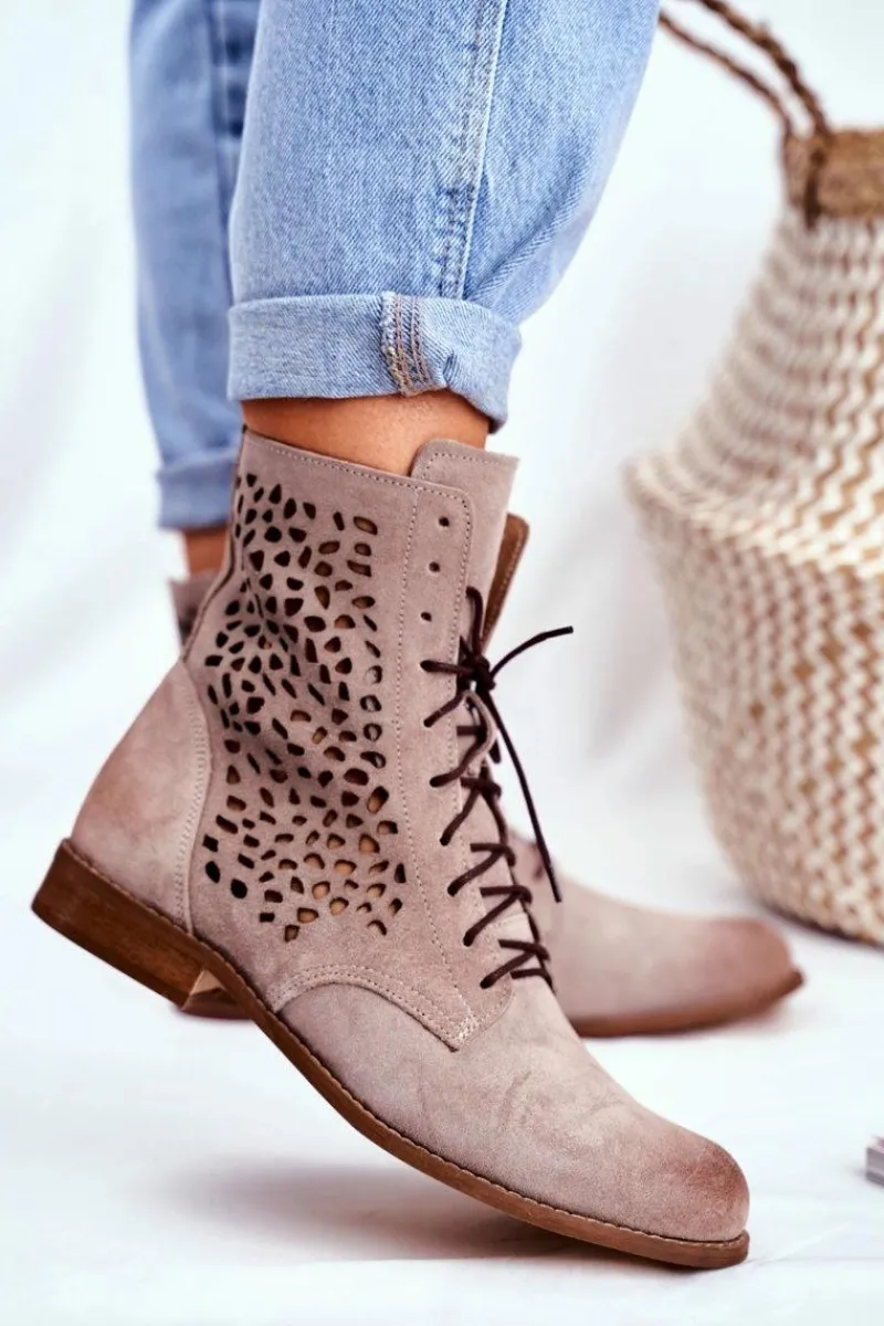 Botki to nie tylko buty na chłodne dni. Świetnie sprawdzą się również podczas tworzenia wiosennych stylizacji. Produkt polski, wykonany w całości ze skóry zamszowej. Delikatny, płaski obcas uniesie Twoją sylwetkę i podkreśli stylizacje. Ażurowy styl nigdy nie wyjdzie z mody. Idealne do zwiewnych sukienek oraz jeansowych spodni. Przy wyborze rozmiaru prosimy sugerować się tabelą rozmiarów.