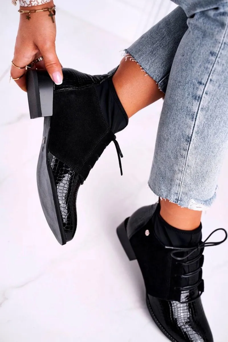 Niezwykle stylowe trzewiki od firmy Maciejka już dostępne! Na pewno przykuwają uwagę swoim niecodziennym designem. Połączenia kilku rodzajów skór o różnej fakturze, nadaje im iście eleganckiego i modnego stylu. Delikatny płaski obcas oraz sznurowana cholewka. Z takimi butami, Ty i Twoje stylizacje z pewnością zostaniecie zauważone. Przy wyborze rozmiaru prosimy sugerować się tabelą rozmiarów.