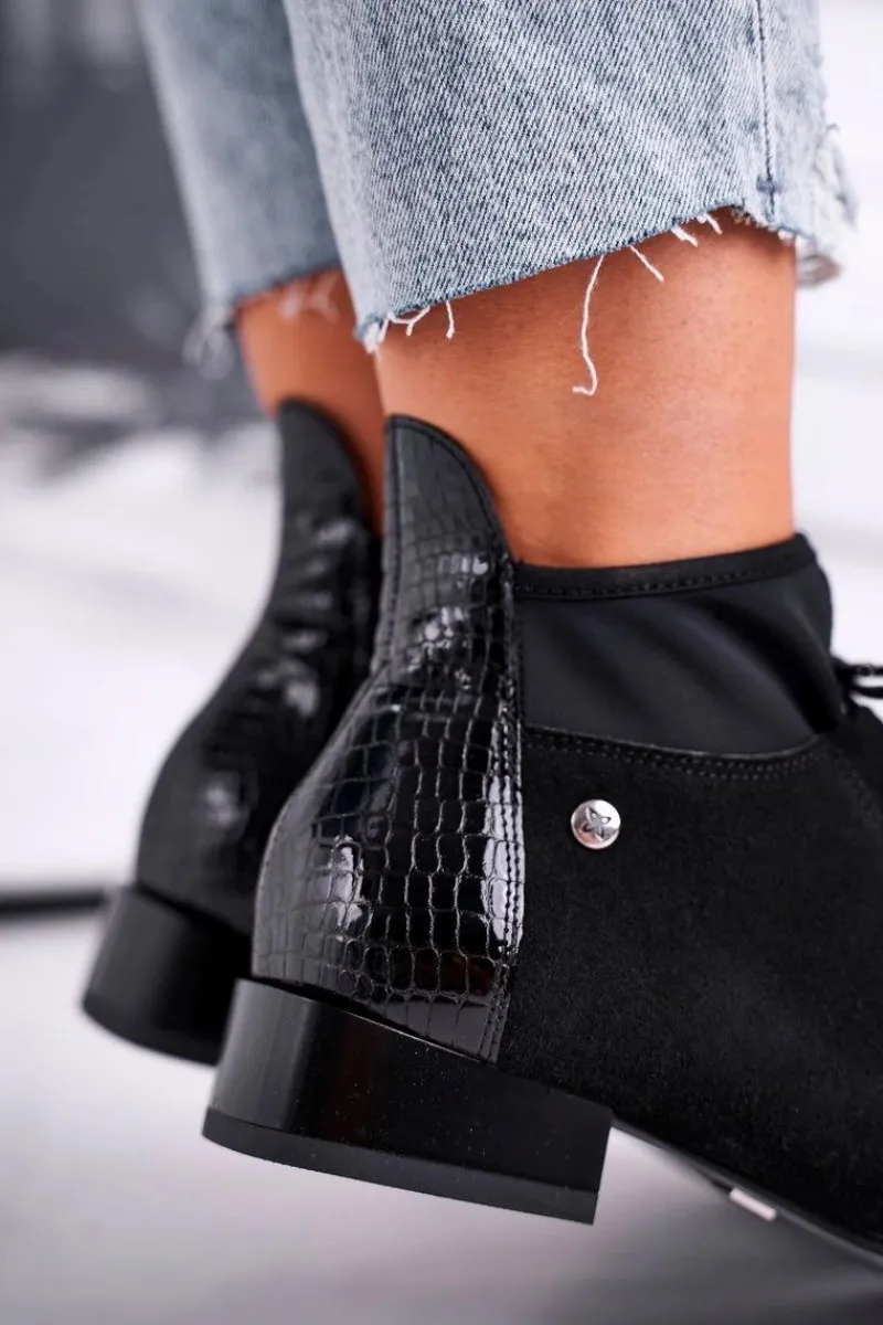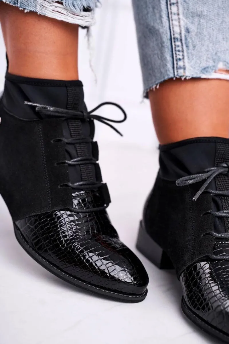 Outlet Botki Damskie Skórzane Trzewiki Czarne 04744-20 Damskie Botki Maciejka|Botki Sznurowane