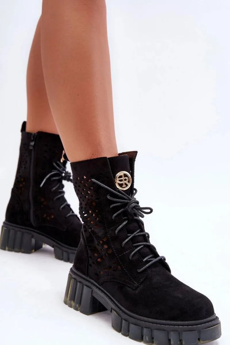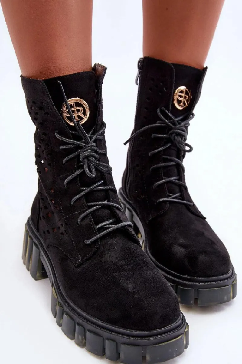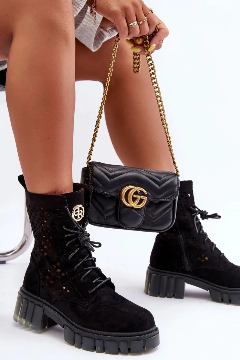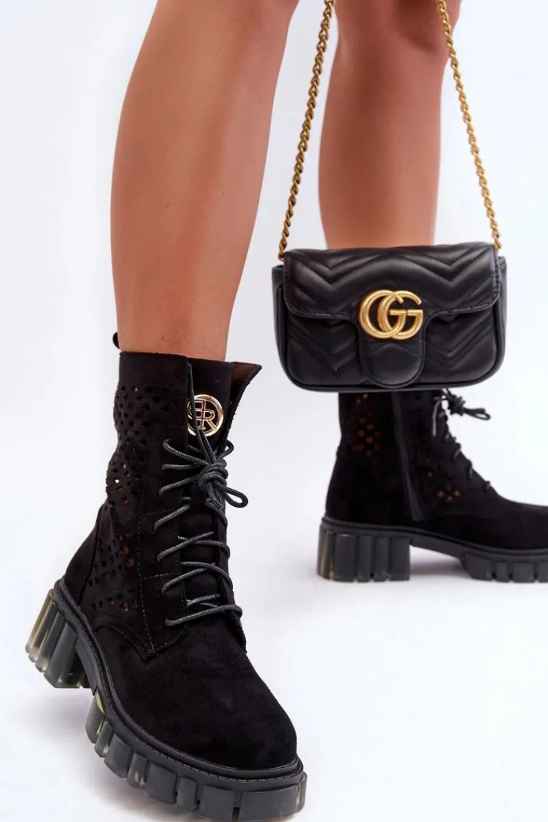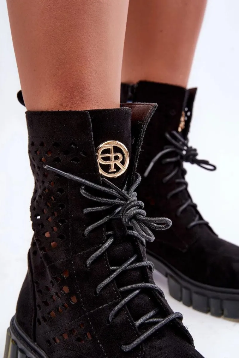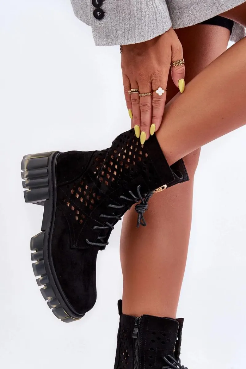 Piękne botki za kostkę zostały wykonane z eko zamszu w ażurowy wzór. Zapinane są z boku cholewki na zamek oraz dodatkowo sznurowane. Botki posiadają usztywniany zapiętek i ozdobę na języku. Botki za kostkę osadzono na masywnym, płaskim obcasie i platformie, które będą chronić przed zimnym podłożem.Przy wyborze rozmiaru prosimy sugerować się tabelą rozmiarów.