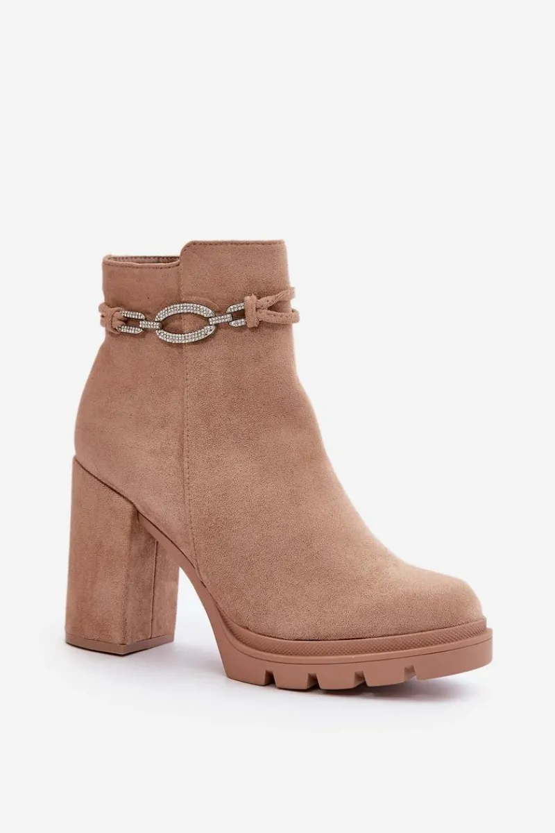 Botki z eko zamszu na wysokim obcasie typu słupek. Zapinane na zamek, co ułatwia zakładanie i zdejmowanie obuwia. Wnętrze ocieplone jest kocem obuwniczym, co gwarantuje komfort w zimniejsze dni. Cholewka ozdobiona jest eleganckim paskiem, który dodaje im stylu i charakteru. Noski zaokrąglone. Przy wyborze rozmiaru prosimy sugerować się tabelą rozmiarów.