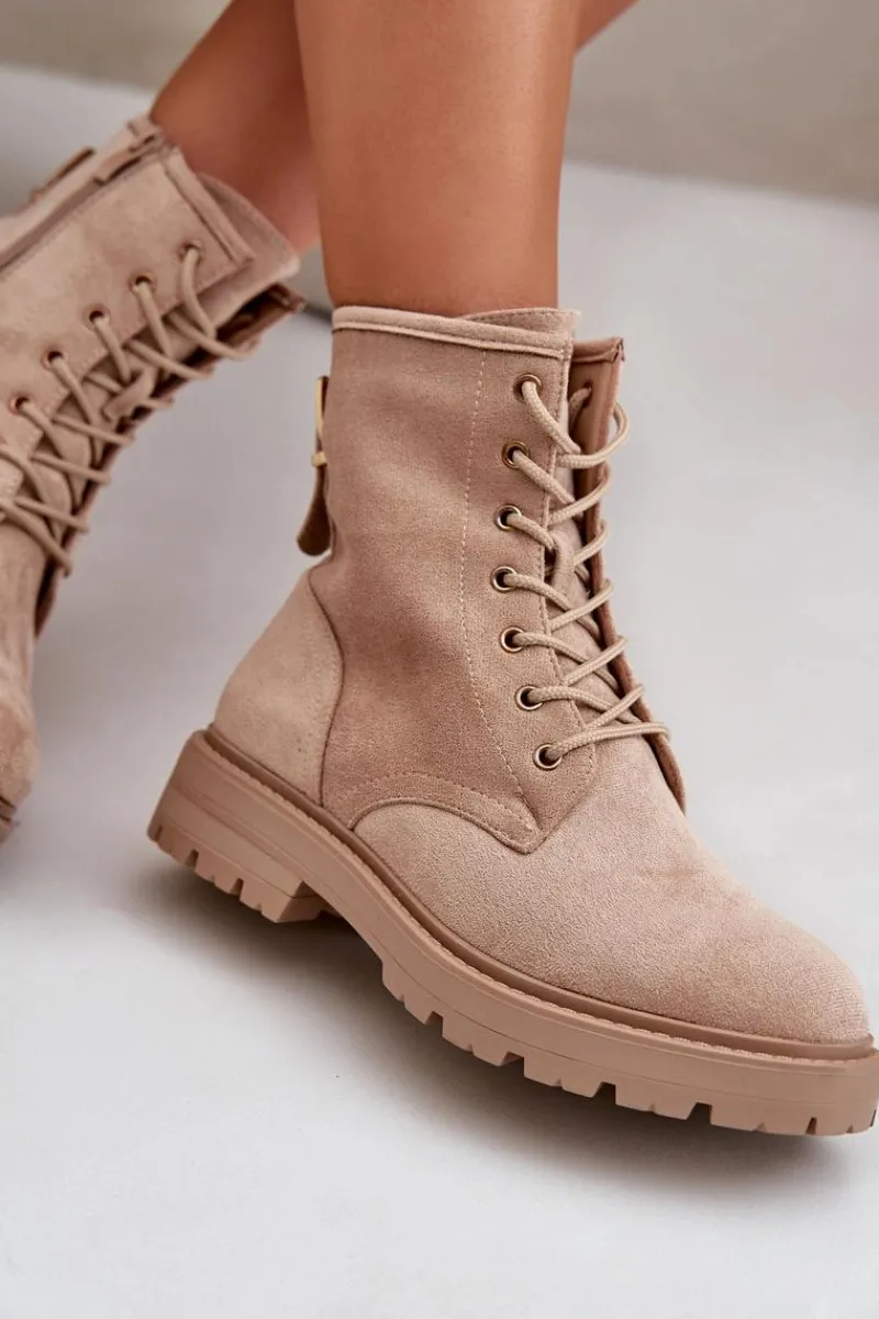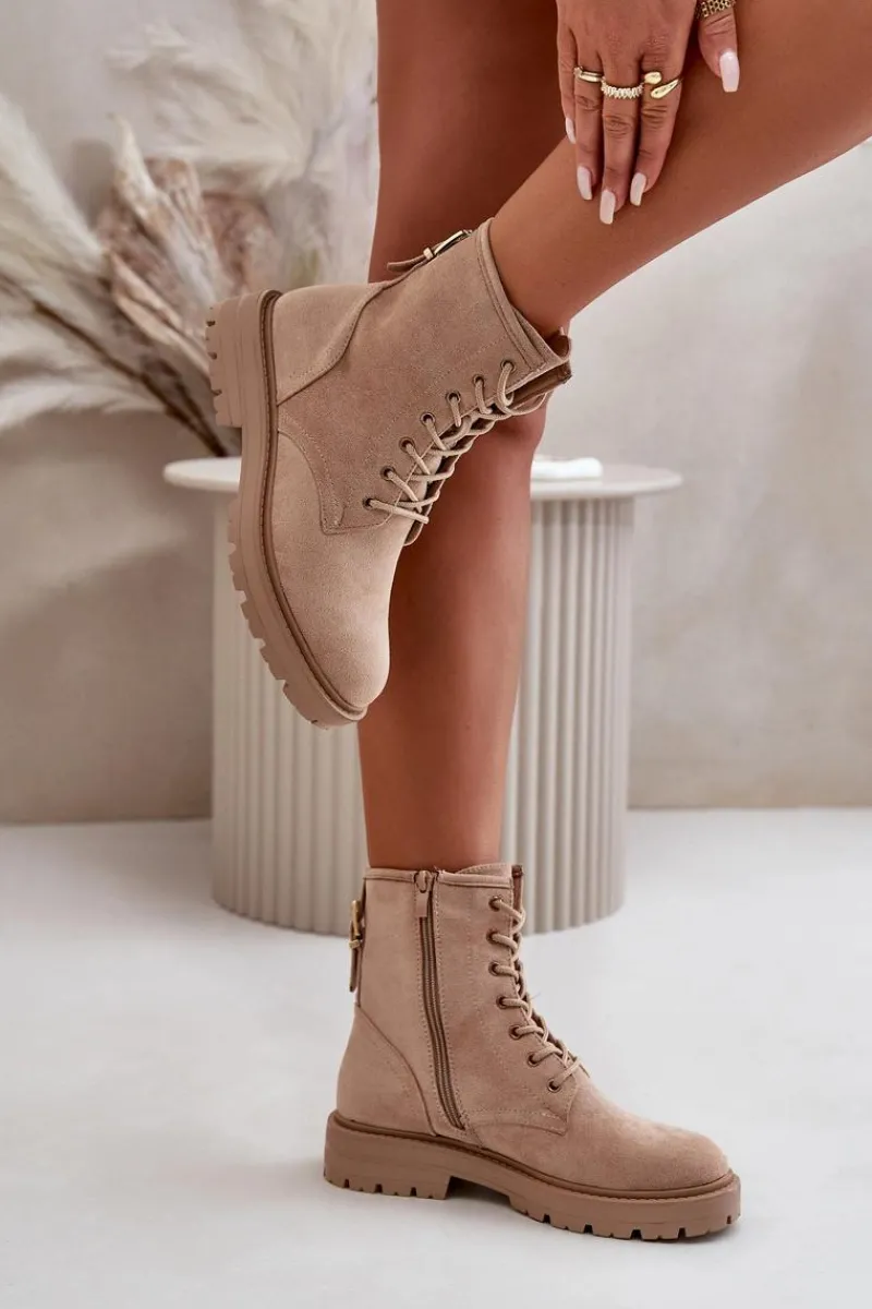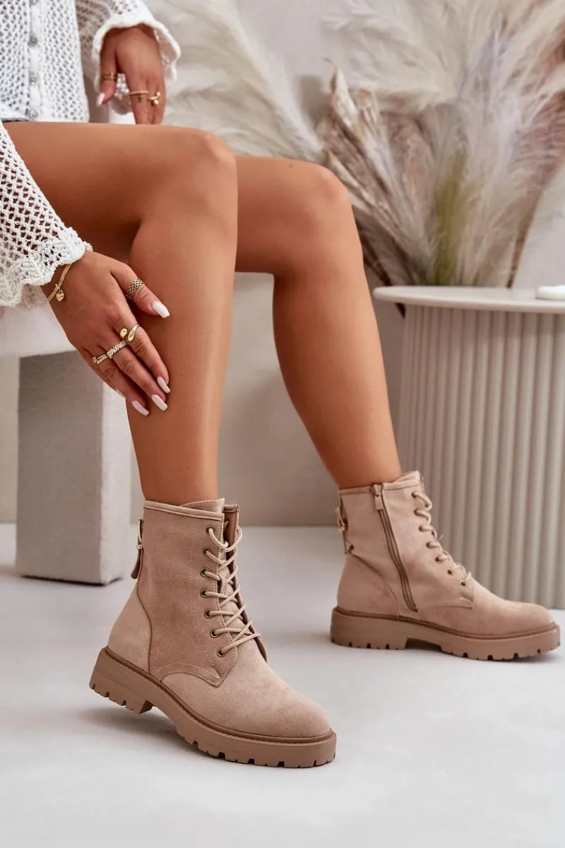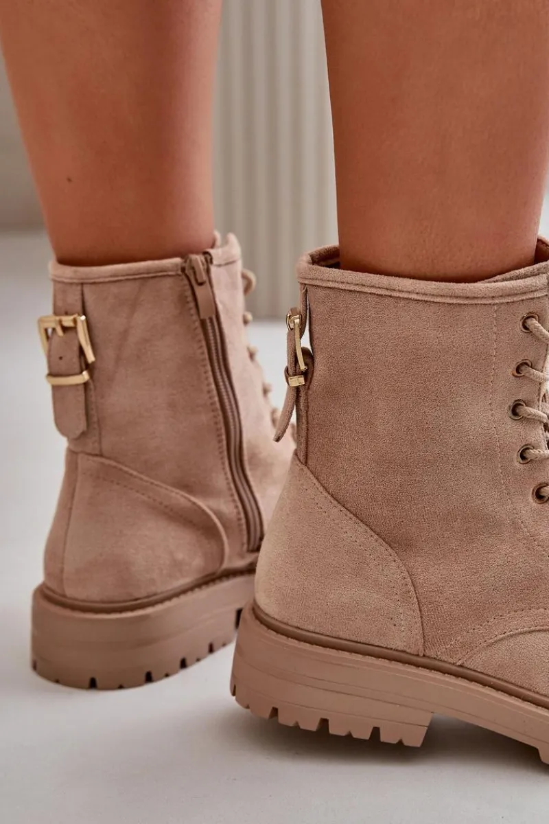 Damskie botki wykonane z miłego w dotyku eko zamszu. Środek ocieplony kocem obuwniczym, co zapewnia komfort w chłodniejsze dni. Model sznurowany, z dodatkowym zapięciem na zamek, co ułatwia zakładanie i dopasowanie do stopy. Idealne na jesienno-zimowe spacery i codzienne stylizacje. Przy wyborze rozmiaru prosimy sugerować się tabelą rozmiarów.