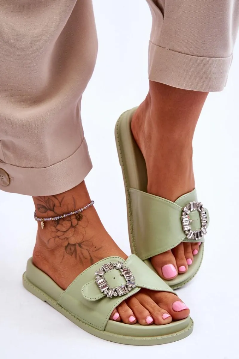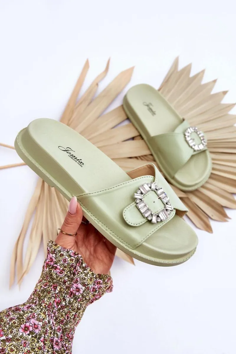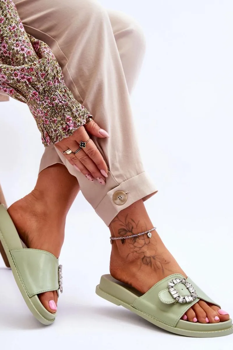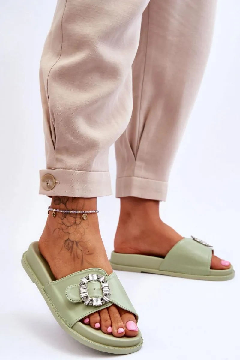Klapki damskie zostały wykonane z eko skóry. Model ten posiada pasek zapinany na sprzączkę, który można regulować. Ozdobna klamra dodaje elegancji. Klapki są idealne na letnie spacery oraz codzienne wyjścia na zakupy. Wkładka wraz z podeszwą zostały wykonane z tworzywa sztucznego. Przy wyborze rozmiaru prosimy sugerować się tabelą rozmiarów.