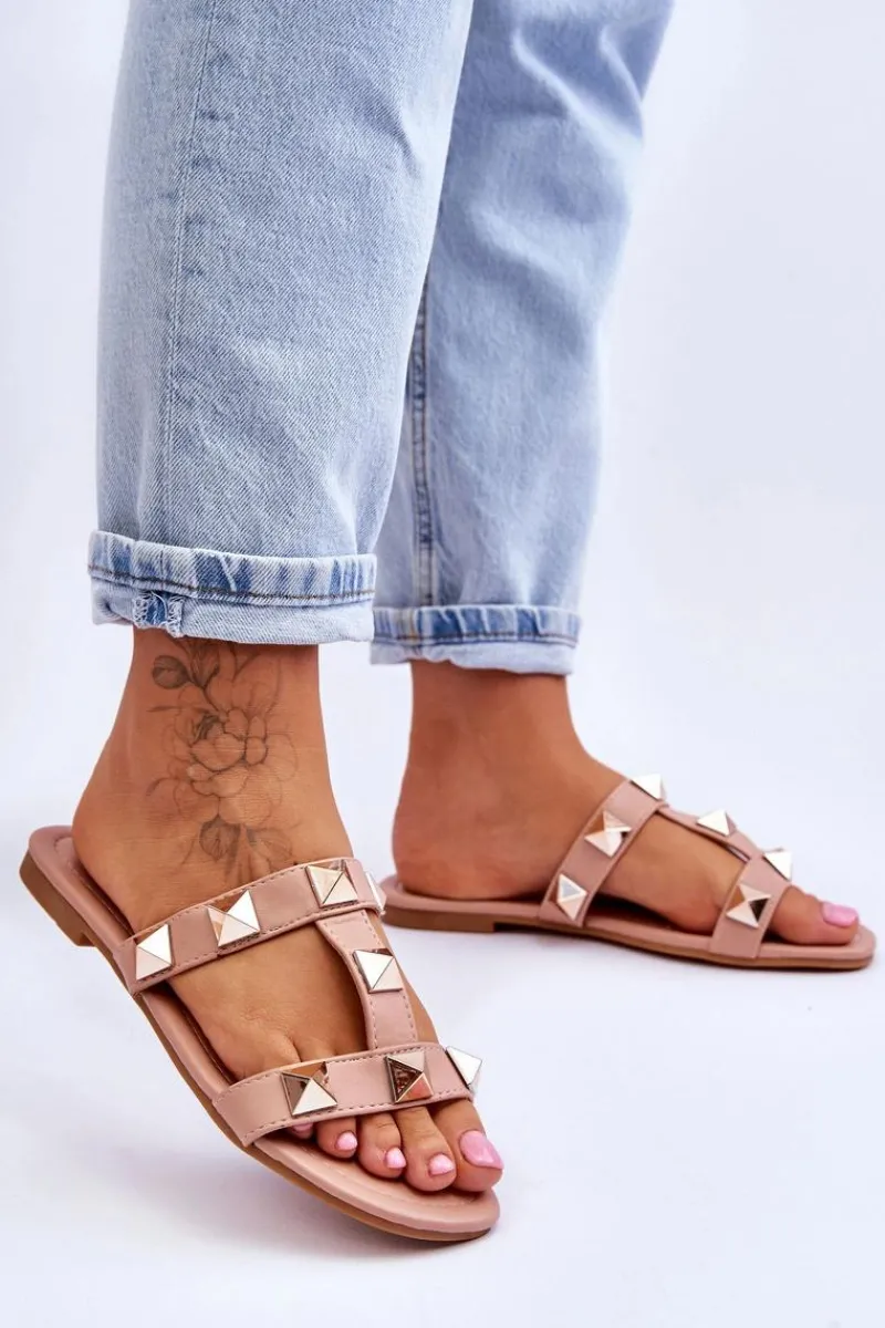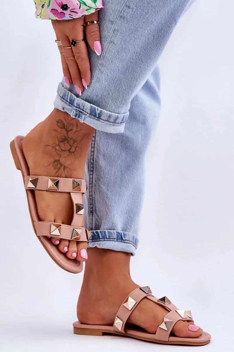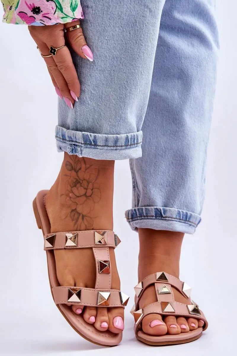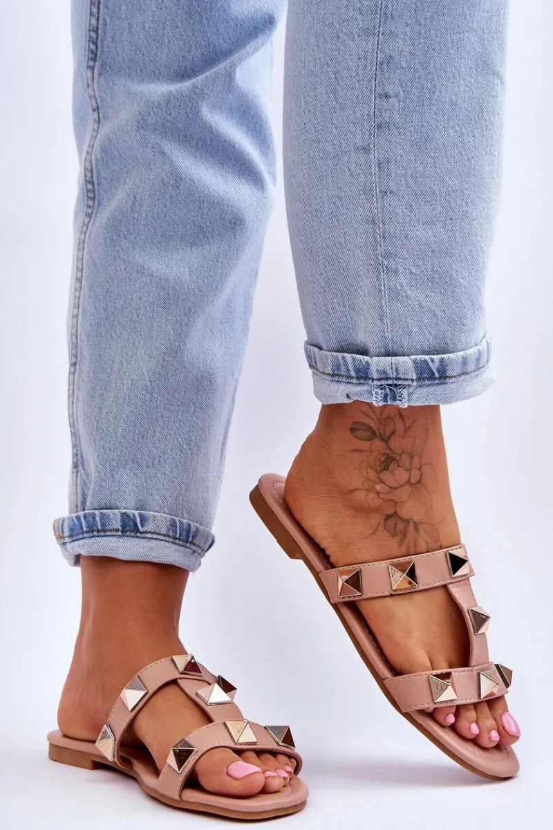 Damskie, klasyczne klapki zostały wykonane z eko skóry. Posiadają modne wycięcia na bokach. Dodatkowo zostały ozdobione dużymi ćwiekami. Klapki osadzono na płaskim obcasie z gumową, antypoślizgową podeszwą. Model ten z pewnością przypadnie do gustu każdej kobiecie podczas upalnych dni. Miękka, eko skórzana wkładka pozwoli na komfortowe użytkowanie obuwia nawet przez cały dzień. Przy wyborze rozmiaru prosimy sugerować się tabelą rozmiarów.
