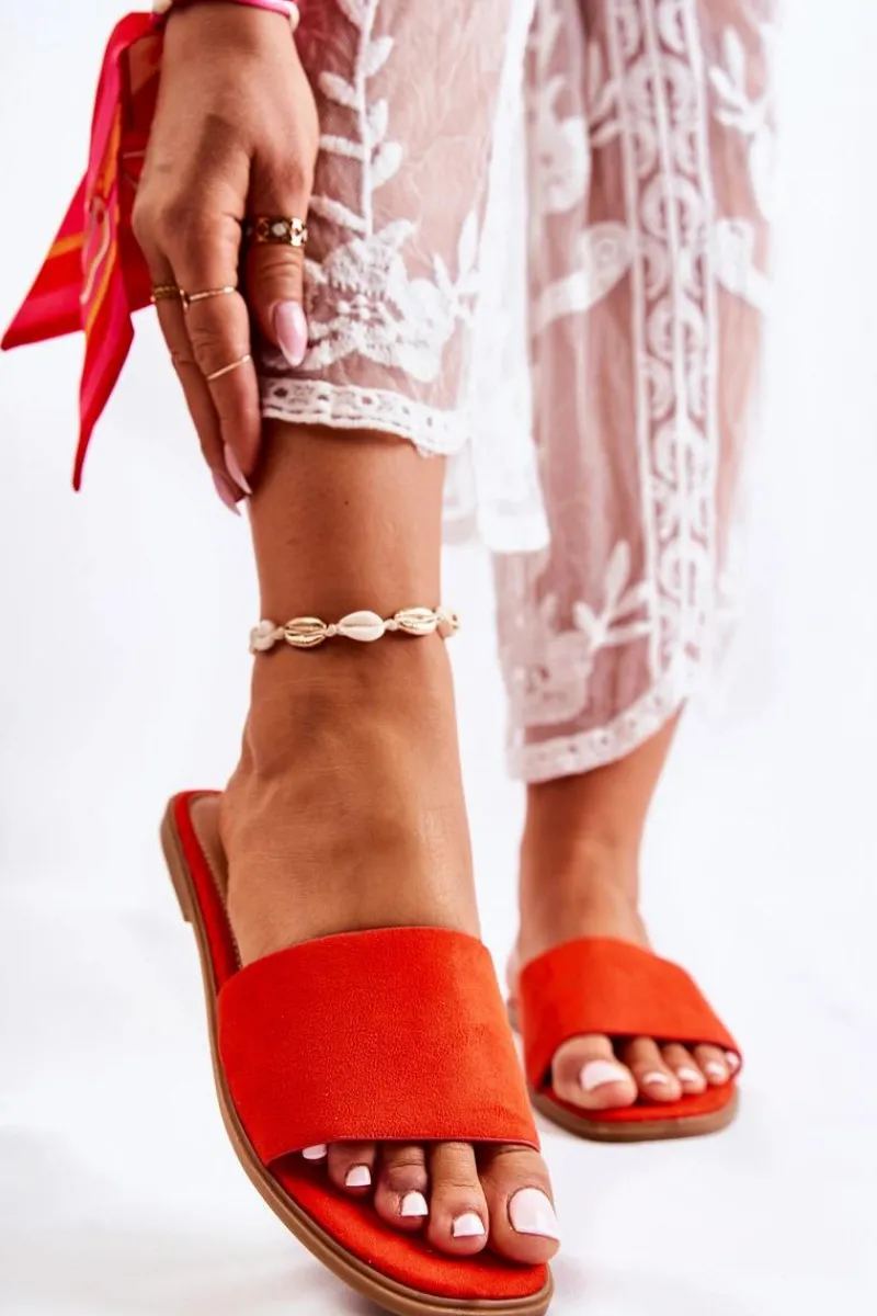 Klasyczne damskie klapki świetnie sprawdzą się w upalne dni! Wykonane z wierzchu z miłego w dotyku eko zamszu. Klapki są gładkie, nie posiadają żadnych ozdób, przez co świetnie będą pasować do stylizacji np.: z wzorami geometrycznymi czy kwiecistymi. Wkładka wykonana z połączenia eko zamszu oraz eko skóry. Nosek odkryty, kwadratowy. Klapki osadzone na płaskim obcasie oraz antypoślizgowej podeszwie wykonanej z gumowego tworzywa. Przy wyborze rozmiaru prosimy sugerować się tabelą rozmiarów.