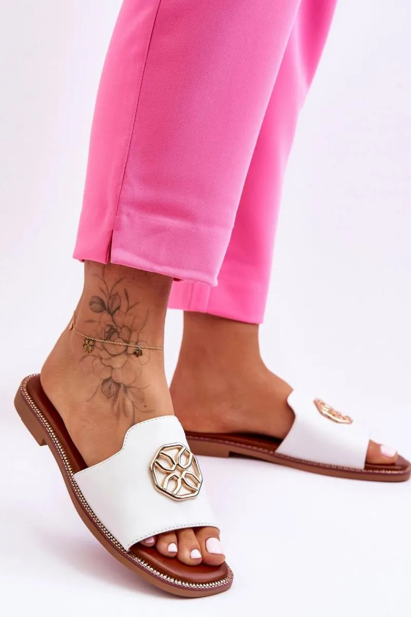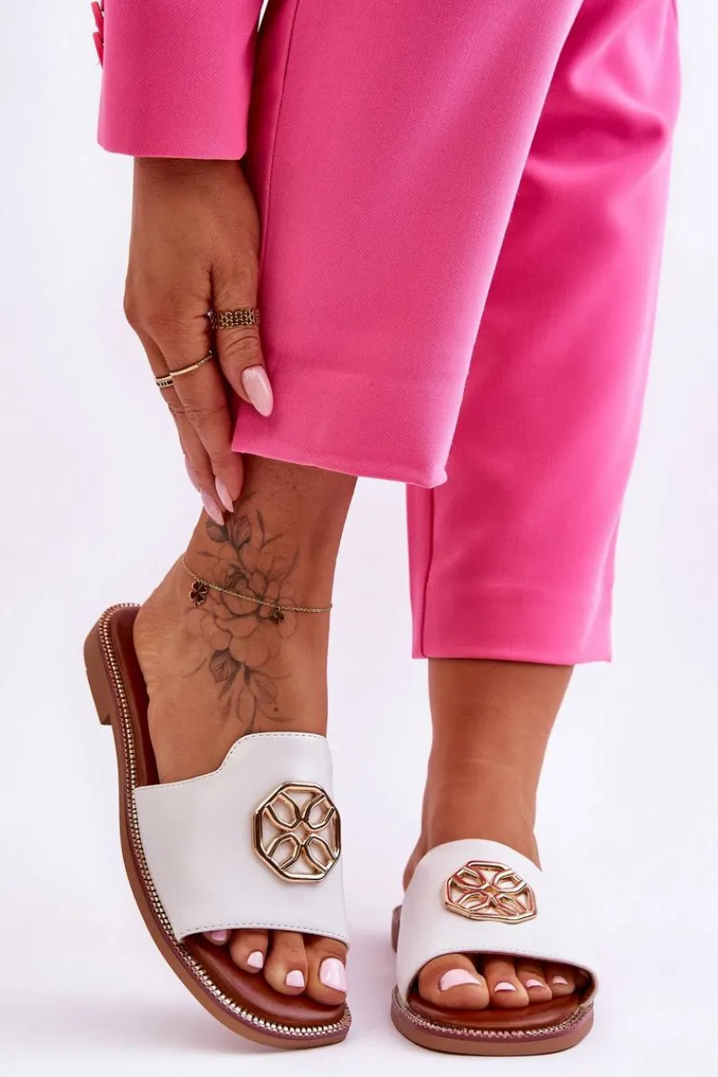 Klasyczne, damskie klapki zostały wykonane z eko skóry. Model ten posiada ozdobę wykonaną z tworzywa sztucznego. Klapki osadzono na delikatnej platformie oraz płaskim obcasie. Wkładka jest niezwykle miękka i wygodna w użytkowaniu. Nosek jest odkryty i lekko kwadratowy. Ten model powinien znaleźć się właśnie w Twojej garderobie! Przy wyborze rozmiaru prosimy sugerować się tabelą rozmiarów.