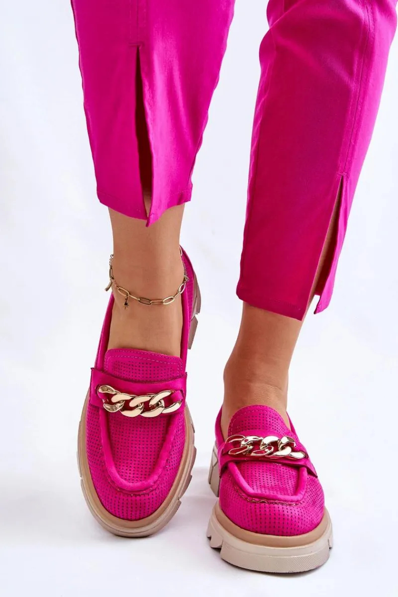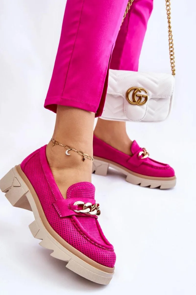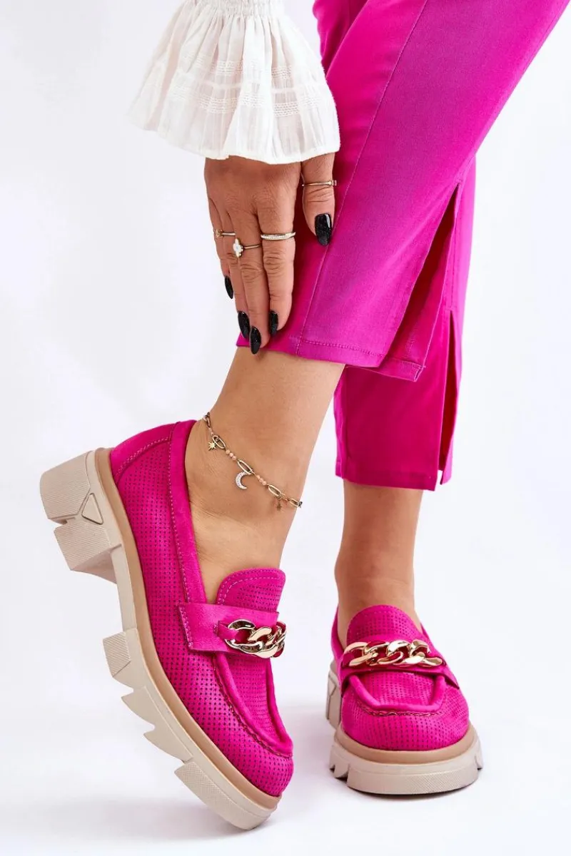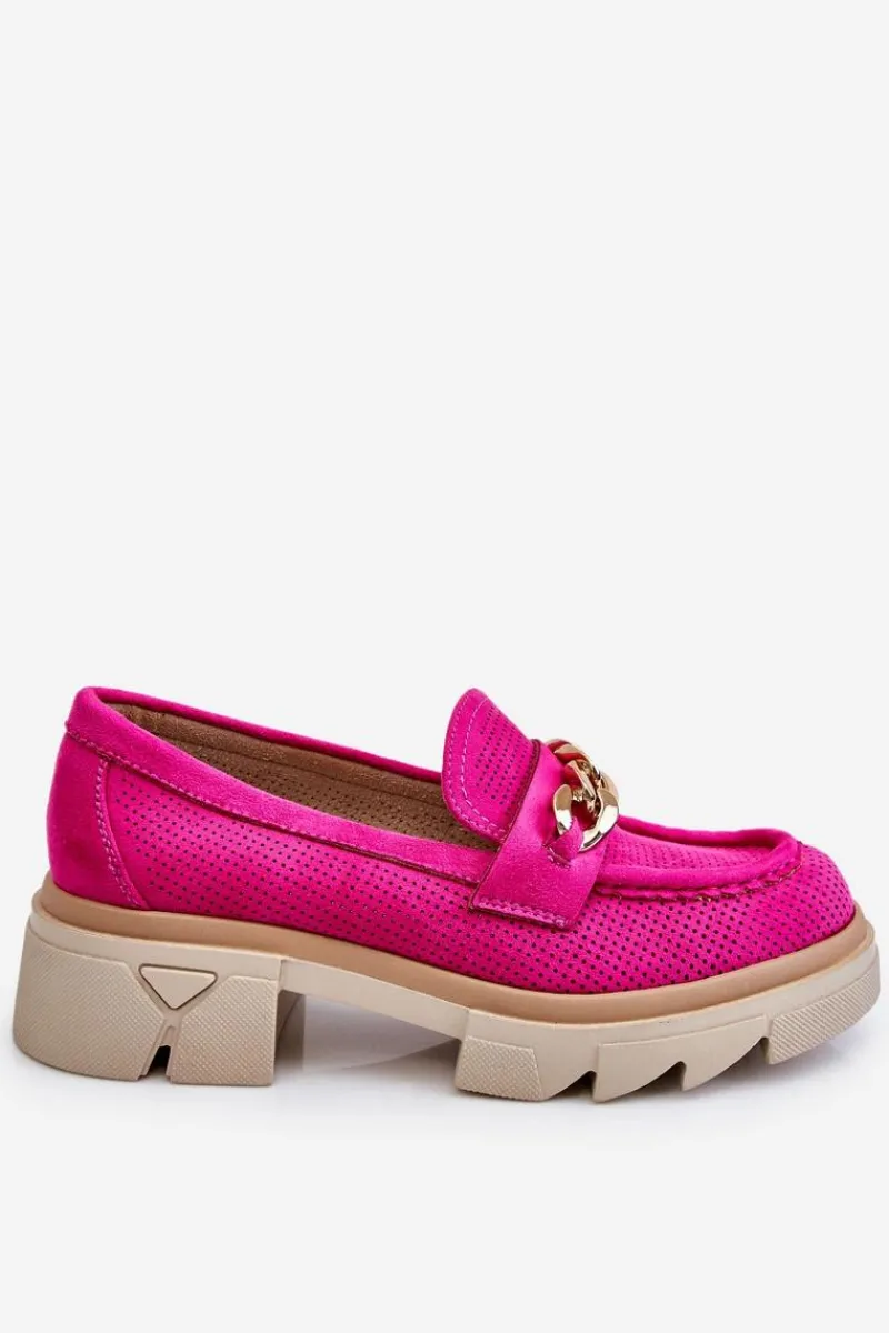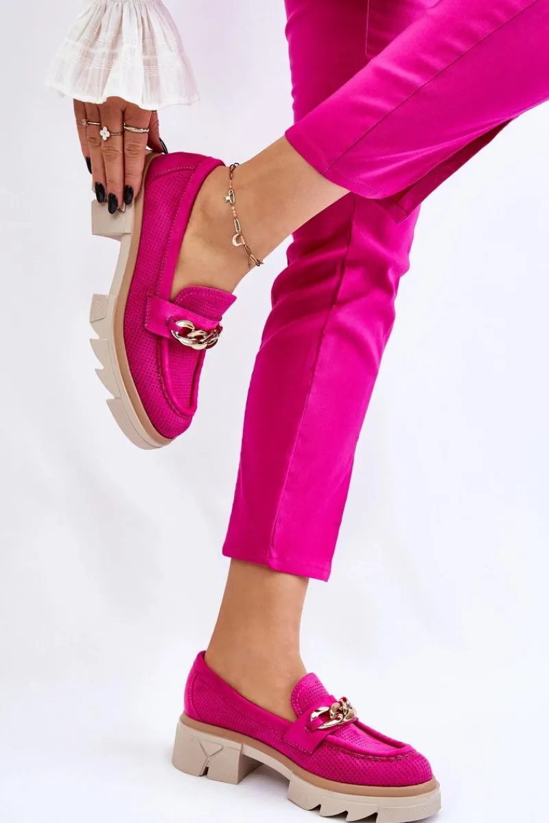 Damskie półbuty w stylu mokasynów zostały osadzone na masywnym, płaskim obcasie i platformie. Ozdobione eleganckim łańcuchem z przodu buta. Wykonane z materiału przypominającego eko zamsz. Miękka wkładka z naturalnej skóry zapewni wygodę podczas użytkowania. Cholewka w ażurowy wzór. Idealny model do wielu stylizacji! Przy wyborze rozmiaru prosimy sugerować się tabelą rozmiarów.