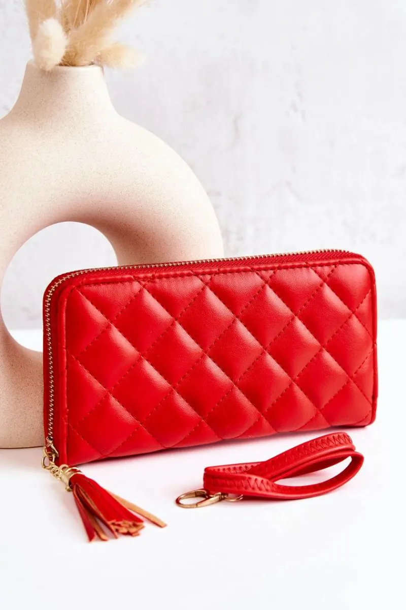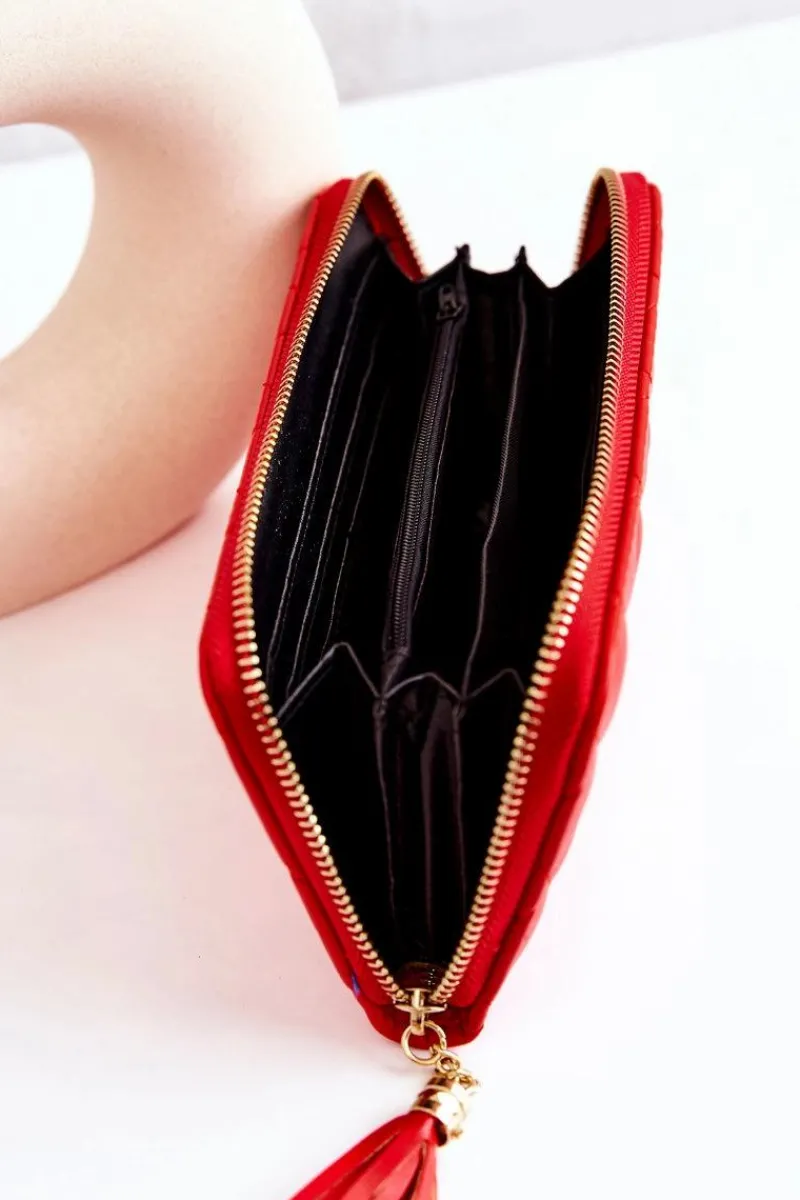 Świetny, duży portfel zapinany na zamek błyskawiczny z frędzelkiem. Posiada dodatkowy paseczek. Portfel pomieści bilon, banknoty oraz posiada otwarte kieszonki na karty i dokumenty. Wykonany został ze skóry ekologicznej, pikowanej. W środku posiada trzy komory z dwoma przegródkami. Znajduje się tam także kieszonka zapinana na suwak. Spraw prezent sobie lub komuś bliskiemu!