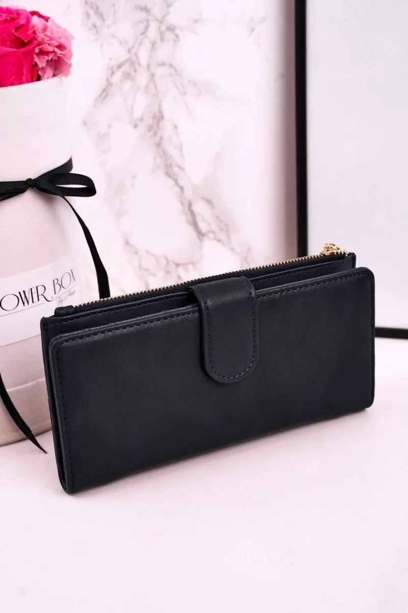 Duży i praktyczny portfel zapinany na zamek i zatrzask. Portfel pomieści bilon, banknoty oraz karty płatnicze i dokumenty. Wykonany ze skóry ekologicznej, dostępny w kilku kolorach. W zestawie znajduje się mała portmonetka zapinana na zamek.