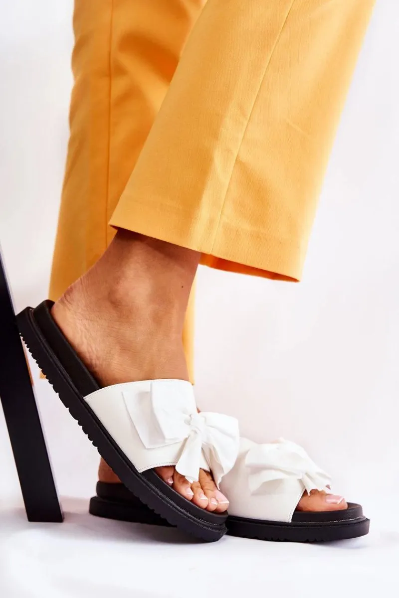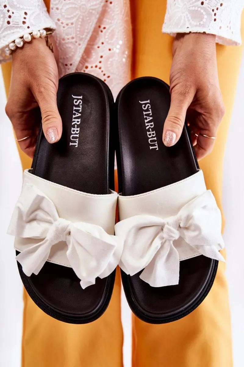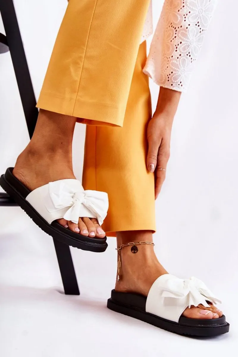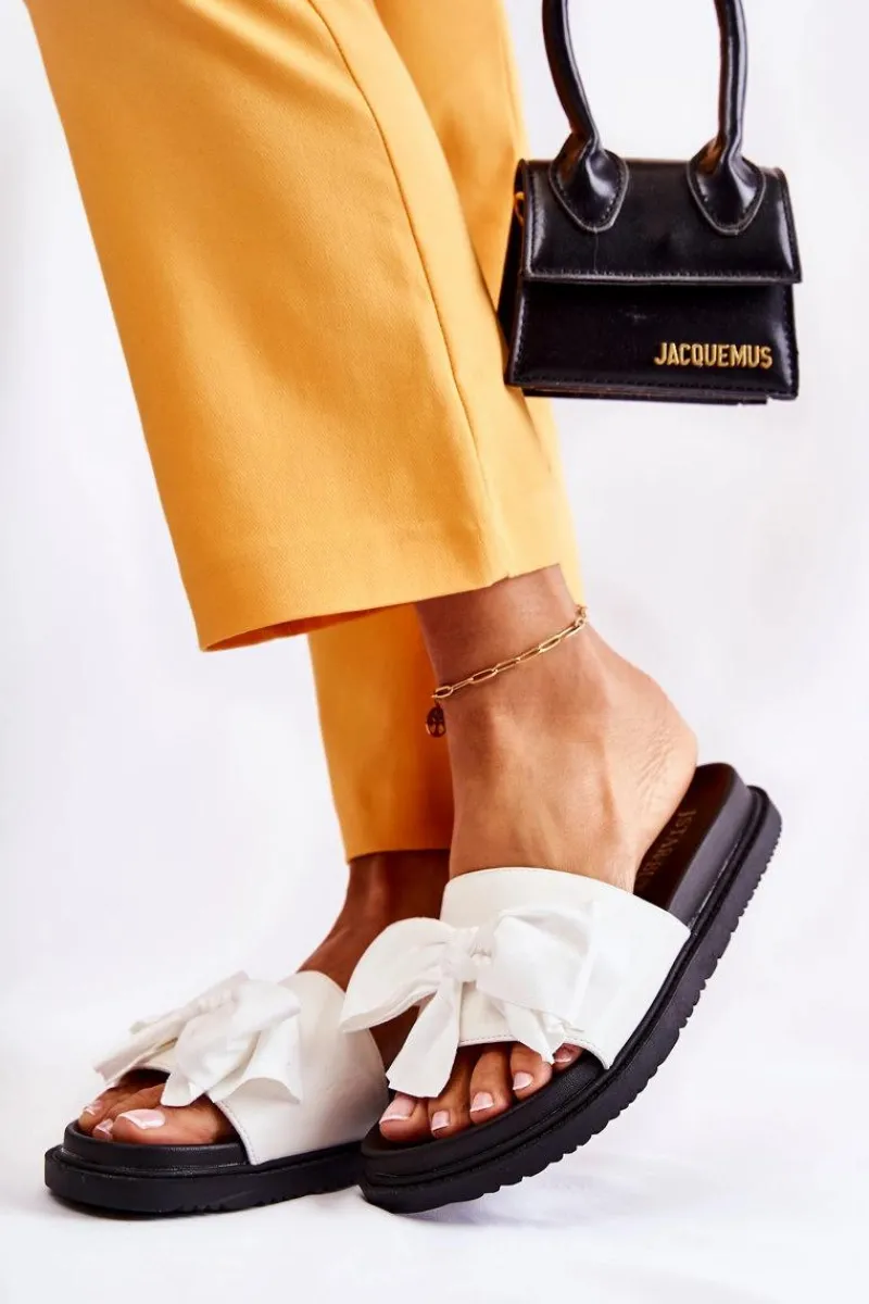 Modne klapki świetnie sprawdzą się podczas upalnych dni! Klasyczny, wsuwany model został wykonany z eko skóry. Eko zamszowa kokarda na przodzie dodaje tym butom elegancji. Klapki osadzone na delikatnej platformie wykonanej z tworzywa sztucznego. Wkładka jest profilowana, wykonana z tworzywa gumowego. Model ten posiada odkryty, zaokrąglony nosek. Podczas wyboru rozmiaru prosimy sugerować się tabelą rozmiarów.